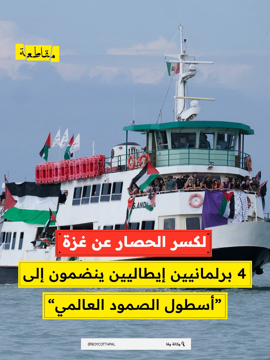 قالت اللجنة الدولية لكسر الحصار عن غزة إن 4 برلمانيين إيطاليين سيكونون على متن سفن "أسطول الصمود العالمي" التي ستبحر في 7 سبتمبر/ أيلول الجاري باتجاه القطاع.
