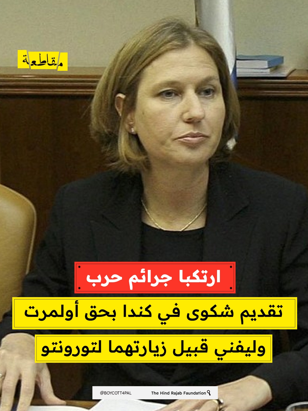قدمت مؤسسة "هند رجب" ومنظمة المحامين الكنديين لحقوق الإنسان الدولية (CLAIHR) والمركز الفلسطيني لحقوق الإنسان (PCHR) اليوم شكوى إلى شرطة الخيالة الملكية الكندية وإلى قسم جرائم الحرب وجرائم الإنسانية في وزارة العدل الكندية، قبل زيارة رئيس الوزراء الإسرائيلي السابق إيهود أولمرت ووزيرة الخارجية السابقة تسيبي ليفني إلى تورونتو.
