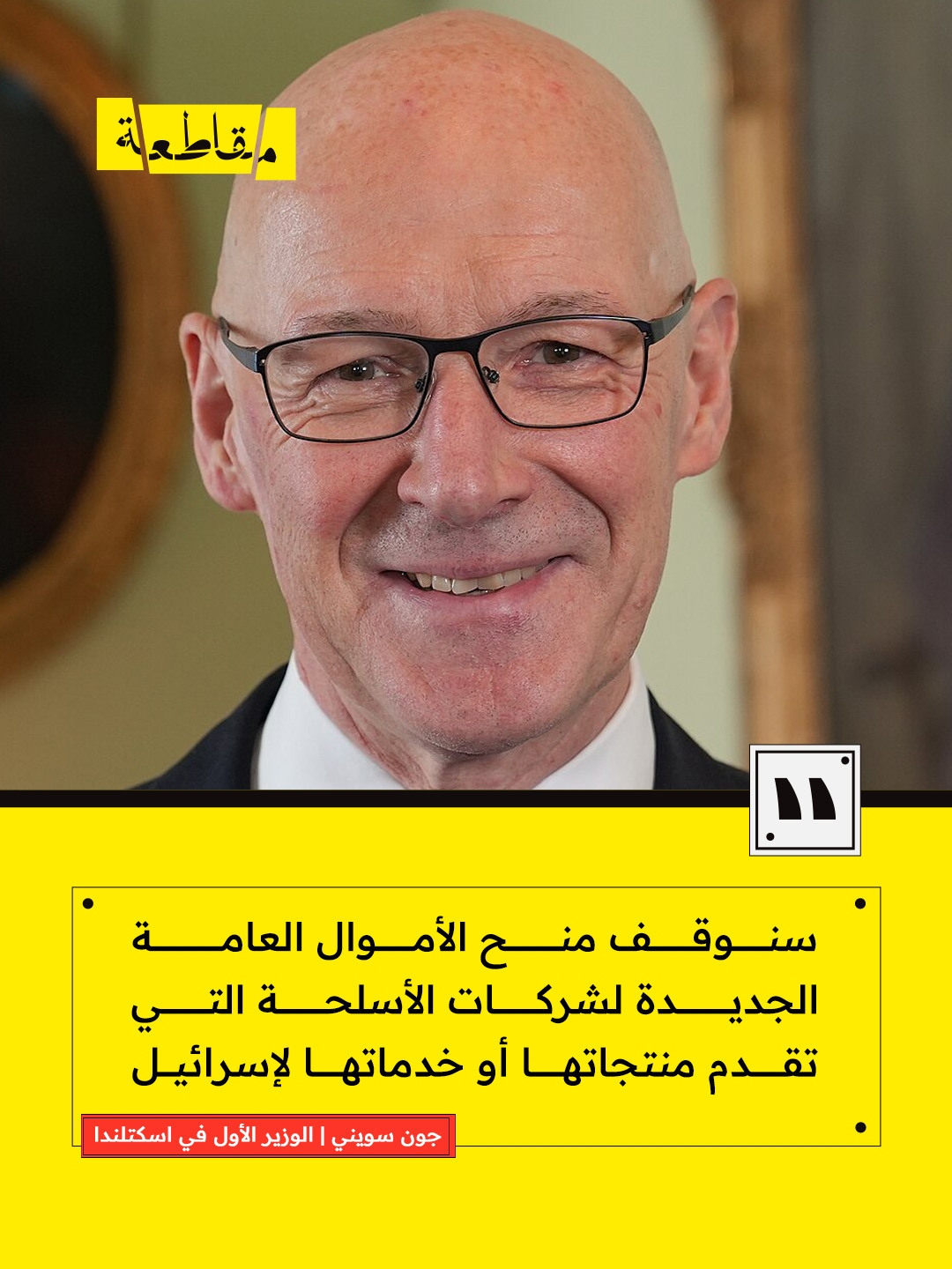 أعلن جون سويني، الوزير الأول في اسكتلندا، أن حكومته ستوقف منح الأموال العامة الجديدة لشركات الأسلحة المتورطة مع الاحتلال. وقال سويني "إن الحكومة الاسكتلندية لا يمكنها تجاهل الأدلة الظاهرة على ارتكاب إسرائيل إبادة جماعية"، داعيًا إلى الاعتراف بدولة فلسطينية كخطوة سياسية تضامنية مع الشعب الفلسطيني. وأضاف أن هذه الخطوة تعكس موقف اسكتلندا الرافض لتواطؤ الدول والشركات مع الاحتلال.