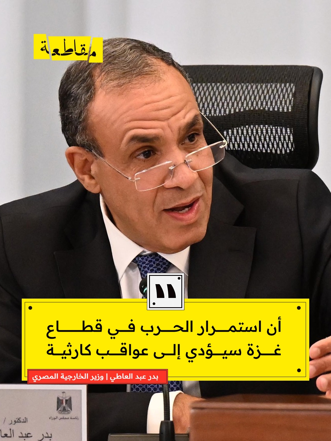 حذَّر وزير الخارجية المصري بدر عبد العاطي، يوم أمس الجمعة، من أن العدوان على قطاع غزة وصل إلى "مفترق طرق" إما أن تنتهي أو تستمر إلى أجل غير مسمى.