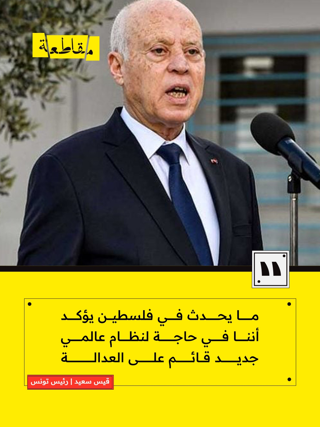قال الرئيس التونسي قيس سعيد، إن المجازر التي يرتكبها الاحتلال الإسرائيلي ضد الشعب الفلسطيني تؤكد أننا في حاجة اليوم إلى نظام عالمي جديد قائم على العدالة والحرية.