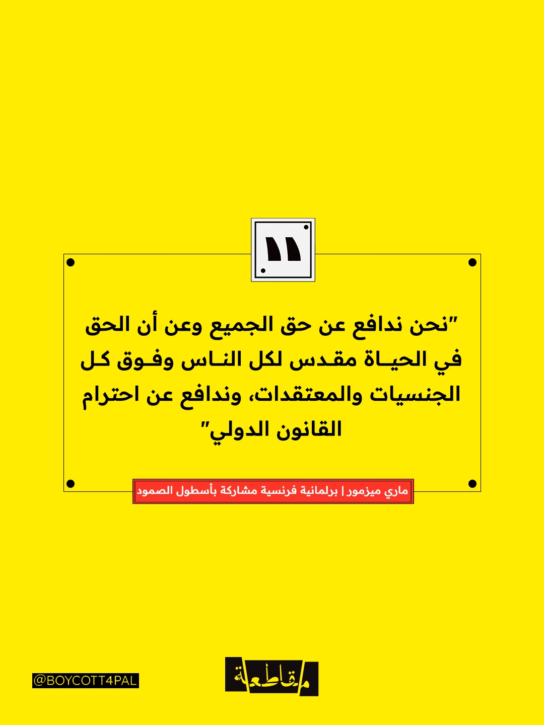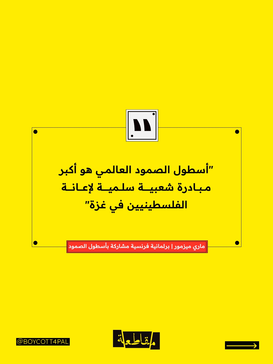قالت البرلمانية الفرنسية ماري ميزمور، المشاركة في "أسطول الصمود العالمي" المتجه إلى غزة لكسر الحصار الإسرائيلي، إنها والمشاركين لا يخشون التهديدات التي توجهها "تل أبيب" للأسطول. وأكدت ميزمور في مقابلة أمس الجمعة، أن مهمتهم هي الدفاع عن الحق في الحياة لكل الناس. وأضافت إن "أسطول الصمود العالمي هو أكبر مبادرة شعبية سلمية لإعانة الفلسطينيين في غزة ".