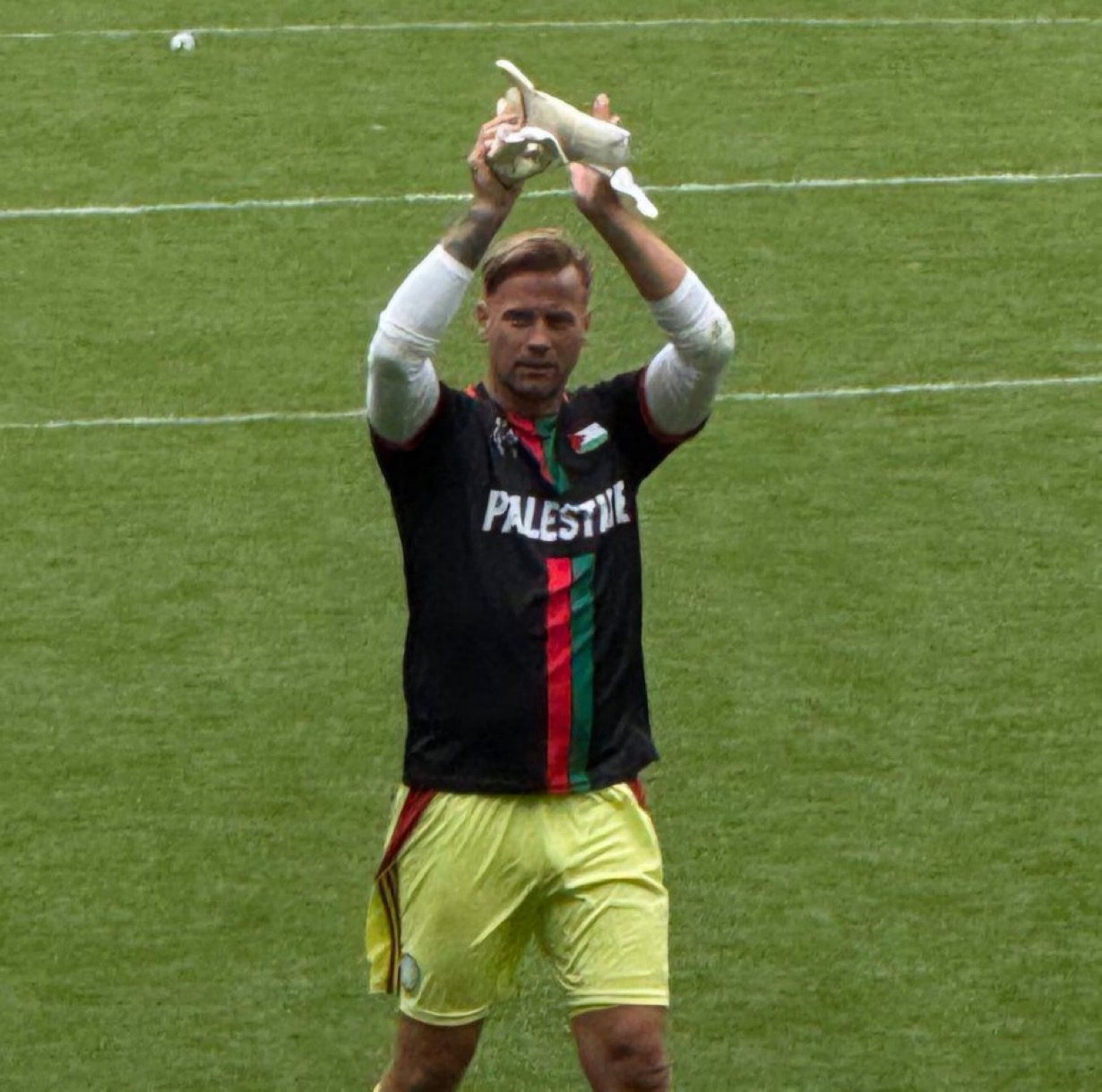 ارتدى حارس مرمى سلتيك، أرتور بوروتش، قميص فلسطين خلال مباراة خيرية للأساطير بين فريقي سلتيك ومانشستر يونايتد في سلتيك بارك. تأتي هذه المبادرة الرمزية في إطار دعم القضية الفلسطينية وإظهار التضامن مع الشعب الفلسطيني.
