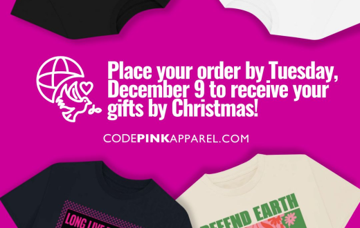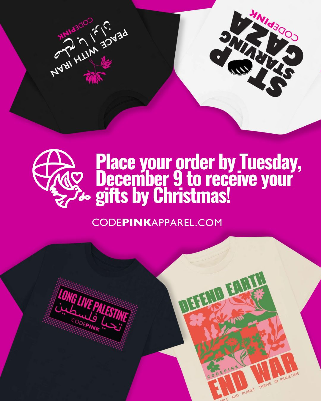 أطلقت منظمة كود بينك حملة جديدة لملابس التضامن، تضمنت تشكيلة من القمصان، الكنزات، الملصقات والحقائب القماشية، تحمل شعارات داعمة لفلسطين مثل "تحيا فلسطين" و"أوقفوا تجويع غزة"، بالإضافة إلى رسائل عامة عن السلام مثل "ازدهر في زمن السلام"".