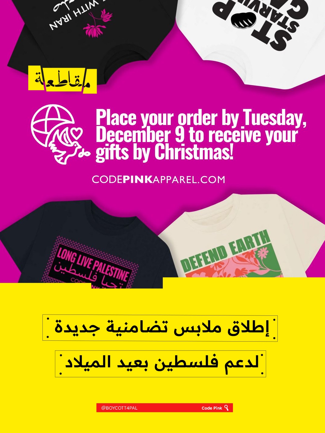 ودعت كود بينك الجمهور إلى تقديم طلباتهم مبكرًا لضمان وصول المنتجات قبل عيد الميلاد، مؤكدة أن كل قطعة ملابس ليست مجرد هدية، بل وسيلة للتعبير عن دعمهم لغزة والمساهمة في نشر الوعي حول القضايا الإنسانية الفلسطينية.
