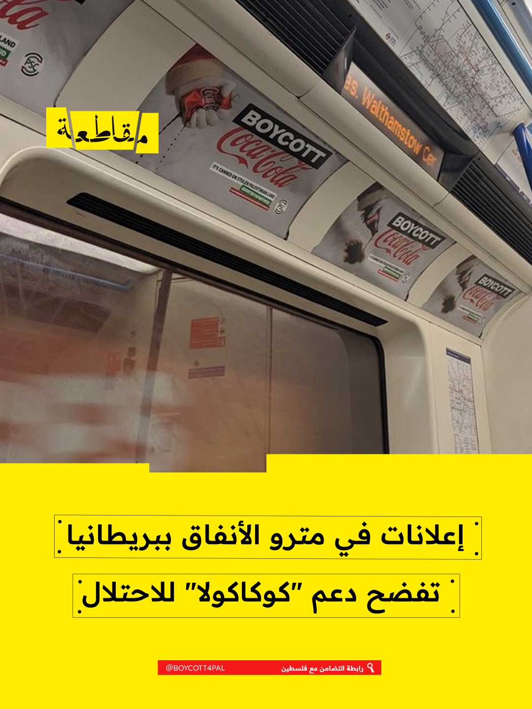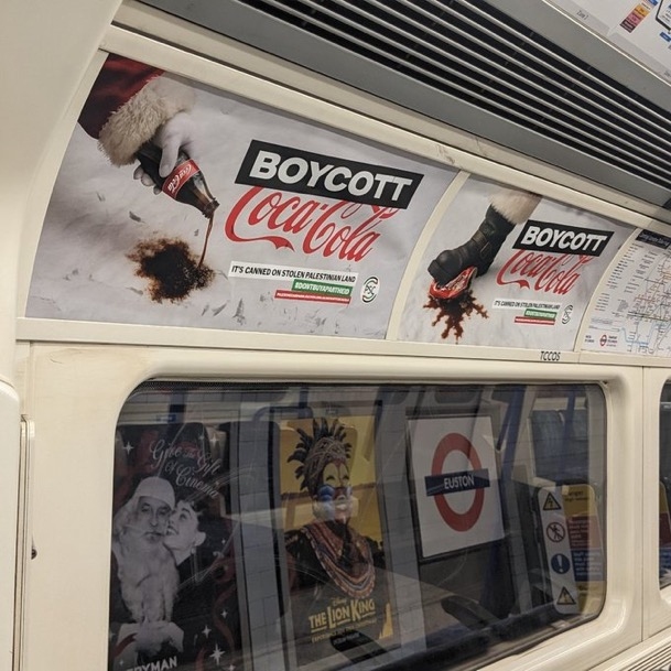 عرض ناشطون ومؤيدون لفلسطين في محطات مترو الأنفاق ببريطانيا إعلانات تكشف الدور المباشر لشركة "كوكاكولا" في دعم الاحتلال العسكري الإسرائيلي ونظام الفصل العنصري. وتشير الحملات إلى أن "كوكاكولا" تعمل في مستوطنات إسرائيلية غير شرعية بُنيت على أراضٍ فلسطينية مصادرة، ما يجعل أي نشاط تجاري هناك جزءًا من منظومة دعم الاحتلال.