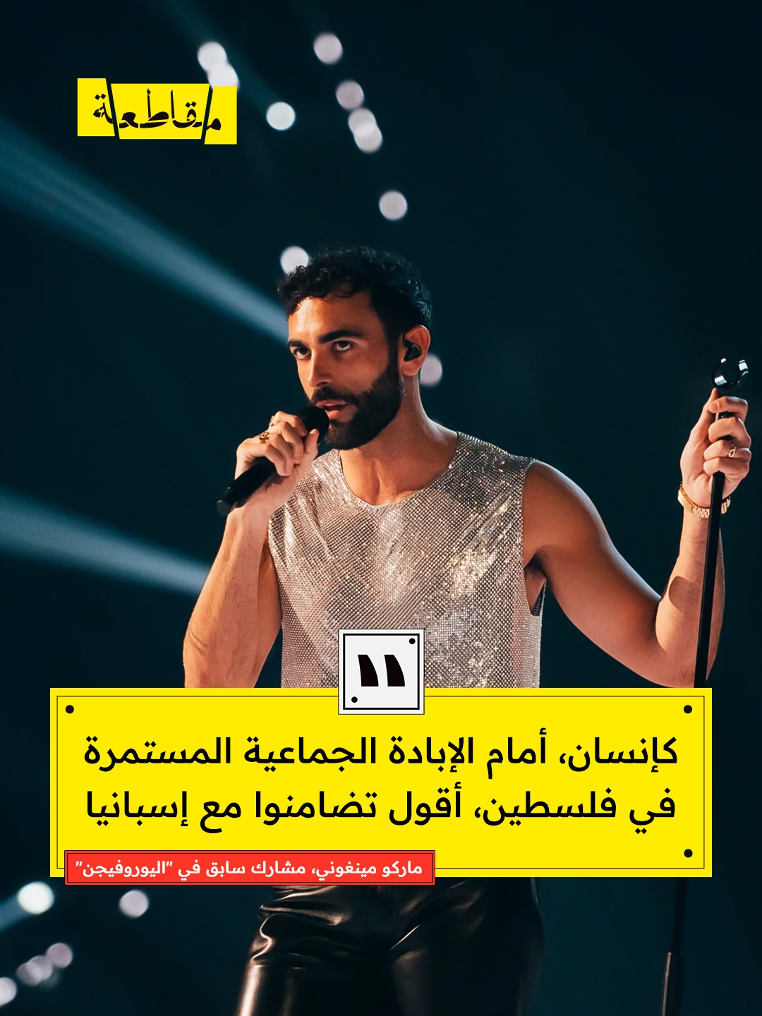 وأوضح أن انسحاب إسبانيا، أيرلندا، هولندا، وسلوفينيا يمثل موقفًا شجاعًا ضد استمرار الاحتلال، ويعكس التضامن مع الشعب الفلسطيني في ظل الإبادة الجماعية المستمرة في غزة. وأكد مينغوني أن الفن ليس مجرد ترفيه، بل وسيلة لنقل الرسائل الإنسانية والسياسية وإيصال صوت العدالة للجمهور.