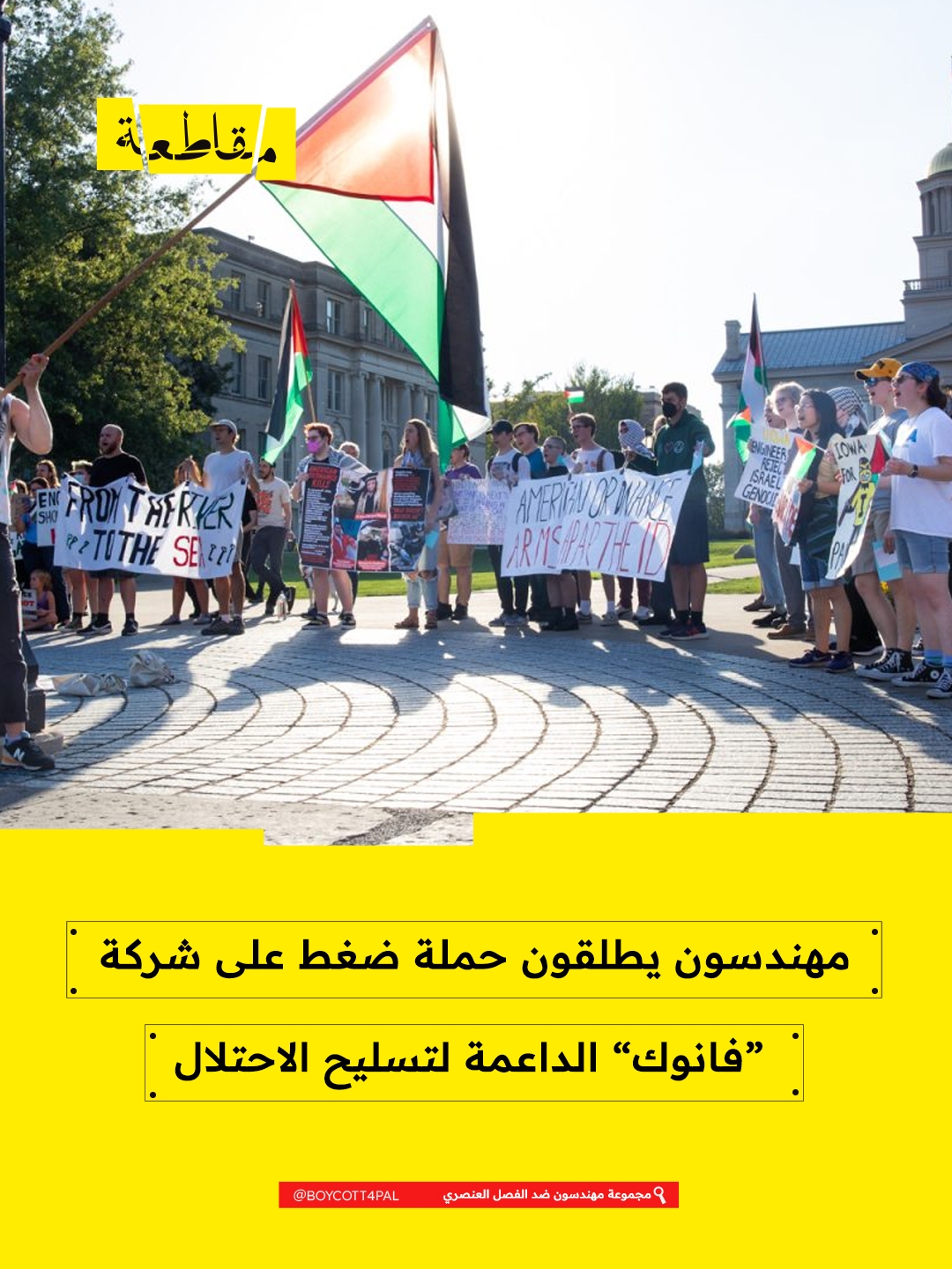 دعت مجموعة "مهندسون ضد الفصل العنصري – ميشيغان" إلى حملة ضغط واسعة ضد شركة فانوك (FANUC) الأميركية، بعد تأكيدها أن الشركة تزوّد شركة إلبيت سيستمز الإسرائيلية بروبوتات تصنيع تُستخدم في إنتاج الأسلحة التي تُقتل بها العائلات الفلسطينية في غزة.