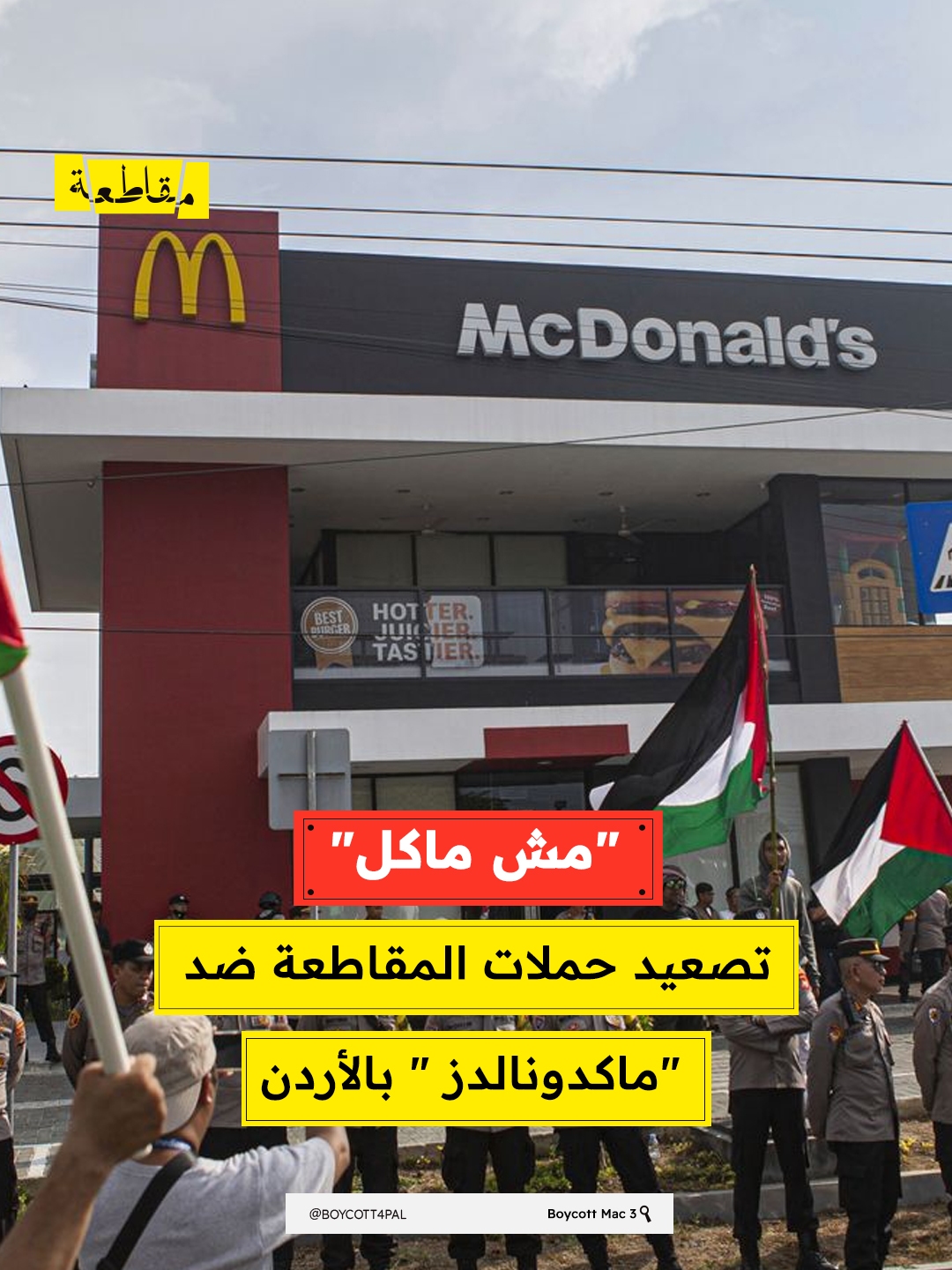 أطلقت "حركة المقاطعة في الأردن" حملة “مش ماكل” ودعت للمواطنين للمشاركة في مقاطعة سلسلة مطاعم "ماكدونالدز" احتجاجًا على تواطؤها مع الاحتلال.