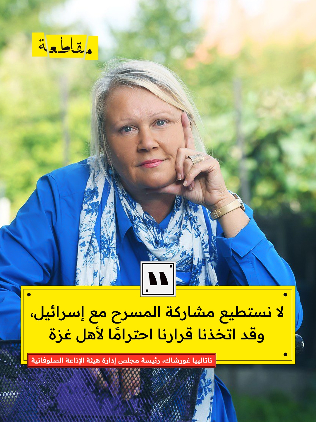 أكدت رئيسة مجلس إدارة هيئة الإذاعة والتلفزيون في سلوفينيا، "ناتالييا غورشاك"، أن قرار بلادها عدم المشاركة في مسابقة الأغنية الأوروبية "يوروفيجن 2026" جاء موقفًا أخلاقيًا وإنسانيًا، مشددة على أن الهيئة لا يمكنها مشاركة المسرح مع طرف لا يحترم حقوق الإنسان.