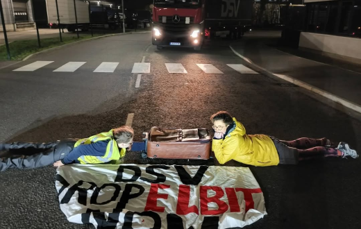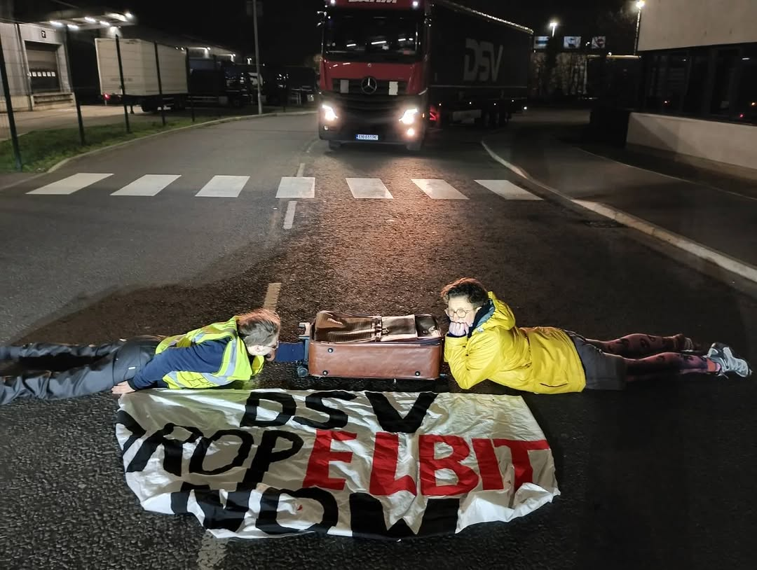 احتج ناشطان من منظمة الناس ضد الإبادة الجماعية بإغلاق الطريق أمام شاحنة تابعة لشركة DSV، احتجاجًا على استمرار إضراب النشطاء عن الطعام من حركة فلسطين “فيلتون 24” وللتنديد بدور شركة “إلبيت سيستمز” الإسرائيلية في صناعة الأسلحة.