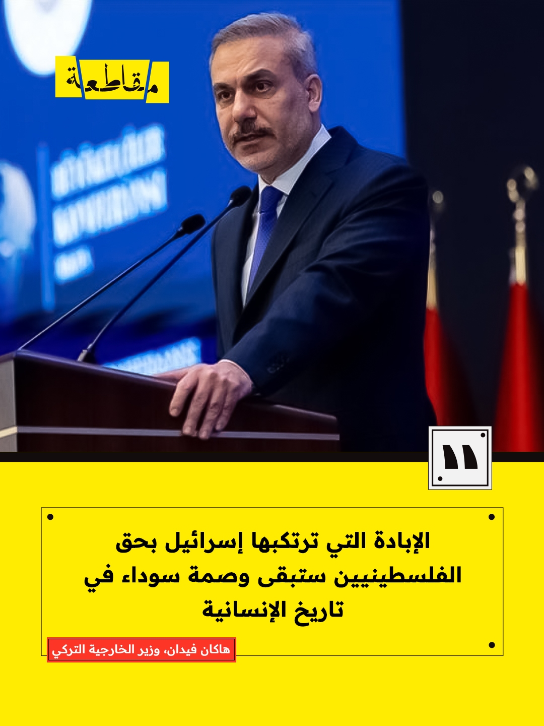 وأكد فيدان إن "الإبادة التي ترتكبها إسرائيل بحق الشعب الفلسطيني في قطاع غزة ستبقى وصمة سوداء في تاريخ الإنسانية، لكنها أسهمت في الوقت ذاته في إيقاظ وعي عالمي تجاه القضية الفلسطينية"