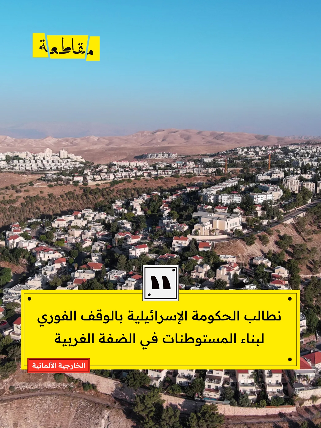 وقالت الخارجية الألمانية "نرفض بشكل قاطع قرار إسرائيل بناء أكثر من 750 وحدة استيطانية جديدة في الضفة الغربية"، مؤكدة أن الاستيطان ينتهك القانون الدولي وقرارات مجلس الأمن ويقوّض حل الدولتين.
