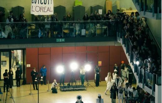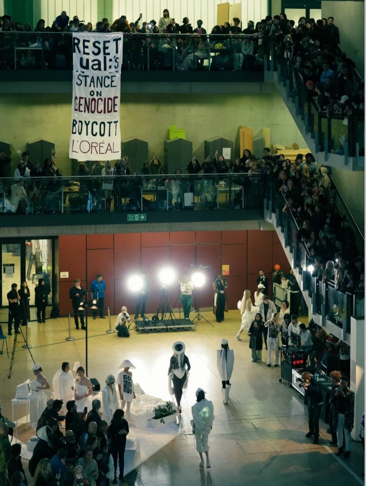 نظّم طلاب جامعة الفنون بلندن (UAL)، من منظمة "طلاب من أجل العدالة في فلسطين" وبمشاركة طلاب من مختلف كليات الجامعة، تحرّكًا احتجاجيًا عطّل عرض "إعادة الضبط"، مطالبين إدارة الجامعة بإنهاء رعايتها لشركة لوريال. وأكّد المحتجون رفضهم استخدام الرسوم الدراسية في دعم الإبادة الجماعية وتطبيع الاحتلال وسرقة الأراضي.