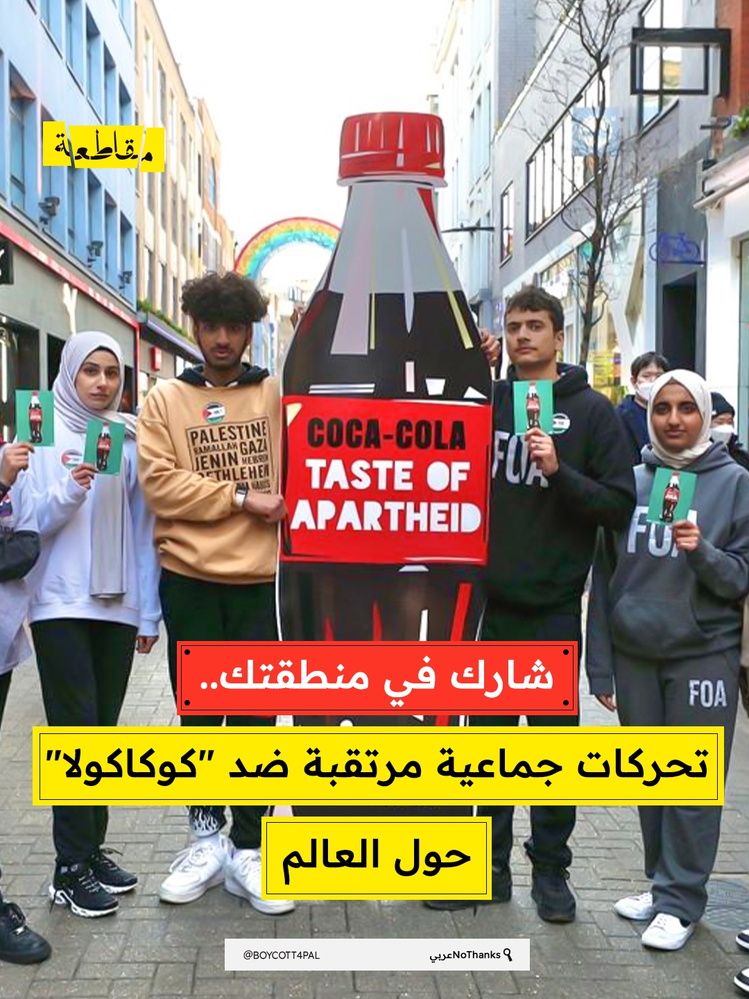أطلقت جمعية أصدقاء الأقصى حملة جديدة لمقاطعة شركة كوكاكولا ومجموعة علاماتها التجارية، بما فيها كوستا كوفي وفانتا وسبرايت وسمارت ووتر، بدءًا من اليوم السبت حتى 19 ديسمبر، احتجاجًا على تشغيلها مصنعًا في مستوطنة عطاروت الإسرائيلية غير الشرعية المبنية على أراضٍ فلسطينية مصادرة، بالإضافة إلى تزويدها جيش الاحتلال بعبوات مجانية.