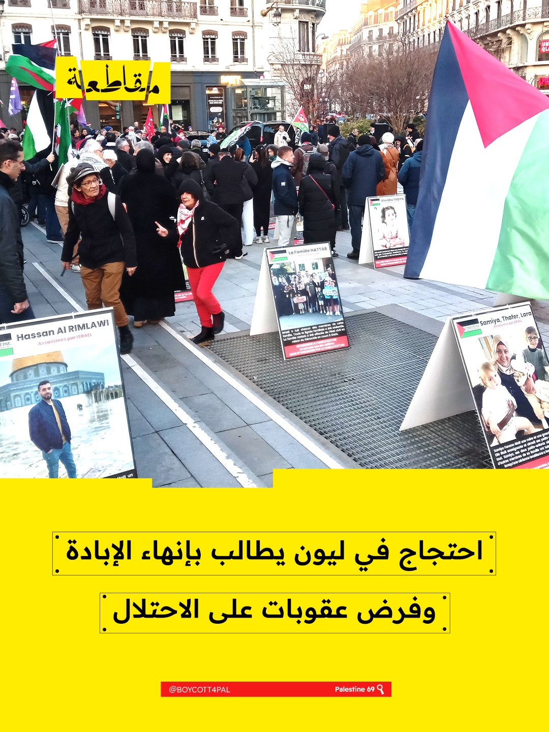 تجمّع عشرات الأشخاص في وسط مدينة ليون أمس السبت، في مظاهرة دعت إليها جمعية Collectif 69 Palestine، للمطالبة بإنهاء الإبادة الجماعية وفرض عقوبات على "إسرائيل". ركز المحتجون على مقاطعة المنتجات والشركات المرتبطة بالاحتلال الإسرائيلي، مؤكدين على ضرورة تحرك الحكومة الفرنسية ووقف التواطؤ من الرئيس إيمانويل ماكرون ووزير الخارجية باروت.
