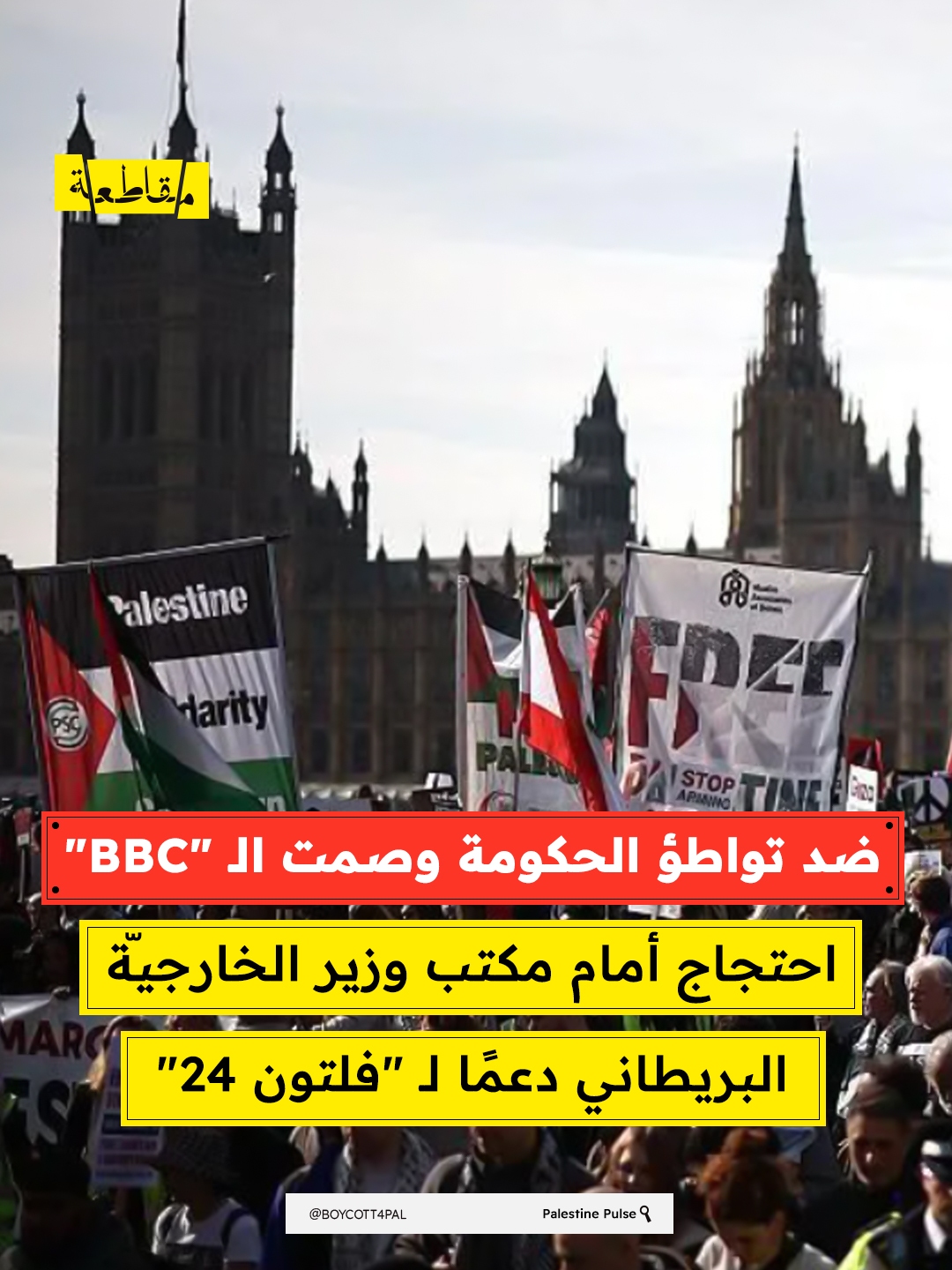 تظاهر ناشطون داعمون لفلسطين من مجموعة Palestine Pulse أمام مكتب ديفيد لامي، وزير الخارجية البريطاني، احتجاجًا على الموقف الحكومي البريطاني المتواطئ مع "إسرائيل" وصمت وسائل الإعلام، وعلى رأسها هيئة الإذاعة البريطانية (BBC)، تجاه قضية المضربين عن الطعام من النشطاء المؤيدين لفلسطين "فلتون 24” في السجون البريطانية.