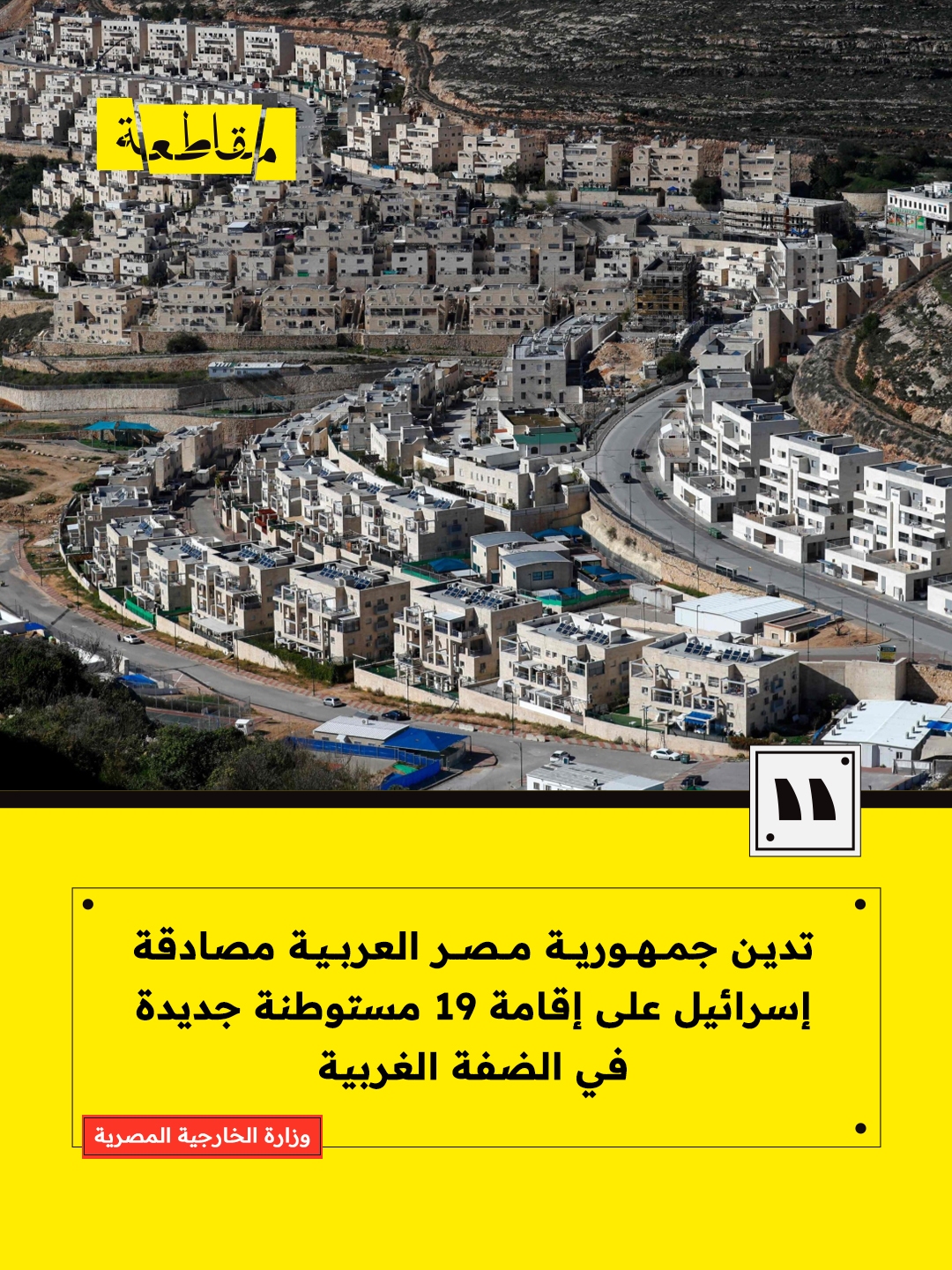 أدانت وزارة الخارجية المصرية مصادقة الاحتلال على إقامة 19 مستوطنة جديدة في الضفة الغربية المحتلة، مشيرة إلى ان ذلك استمرارًا للتوسع الاستيطاني المخالفة للقانون الدولي.