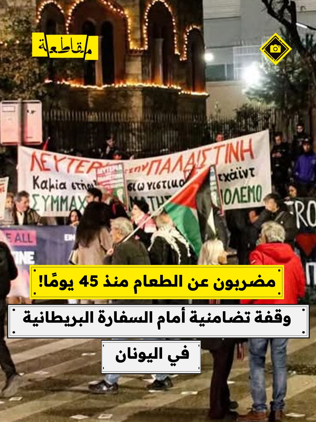 نظمت حركة Anti-Imperialist Front في اليونان وقفة تضامنية أمام السفارة البريطانية في أثينا دعماً للمضربين عن الطعام من المعتقلين السياسيين الفلسطينيين في السجون البريطانية.