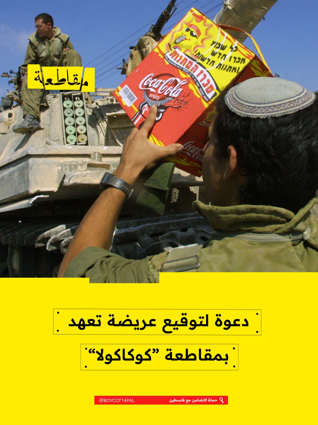 أطلقت حملة التضامن مع فلسطين عريضة شعبية لمقاطعة شركة كوكاكولا، مطالِبة المستهلكين حول العالم بالامتناع عن شراء جميع منتجاتها إلى حين وقف تواطؤها مع الاحتلال الإسرائيلي.