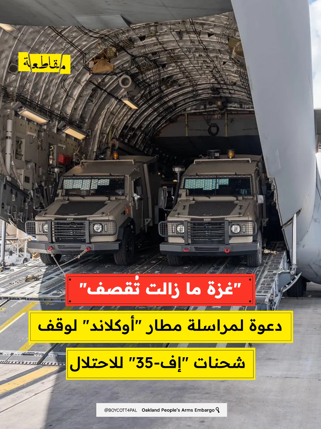 دعت مجموعة “أوكلاند حظر الأسلحة الشعبية إلى اتخاذ إجراءات ضد استخدام مطار أوكلاند المدني بولاية كاليفورنيا الأمريكية لنقل مكونات طائرات مقاتلة من طراز F-35 وقطارات قنابل متجهة إلى الجيش الإسرائيلي، بالتزامن مع موسم العطلات.
