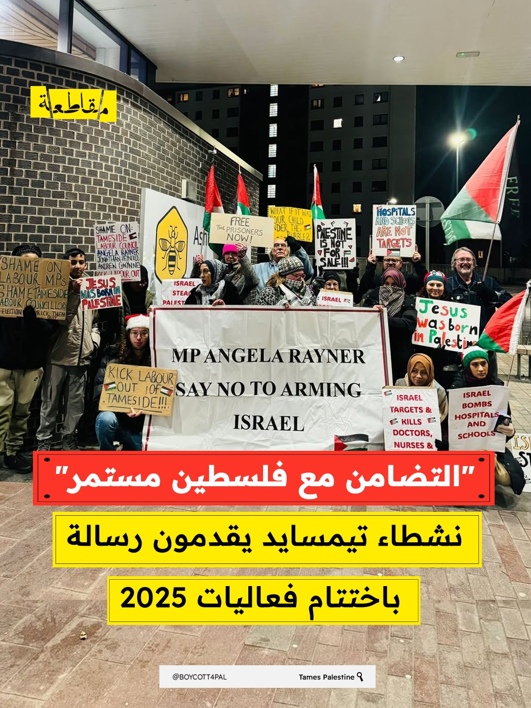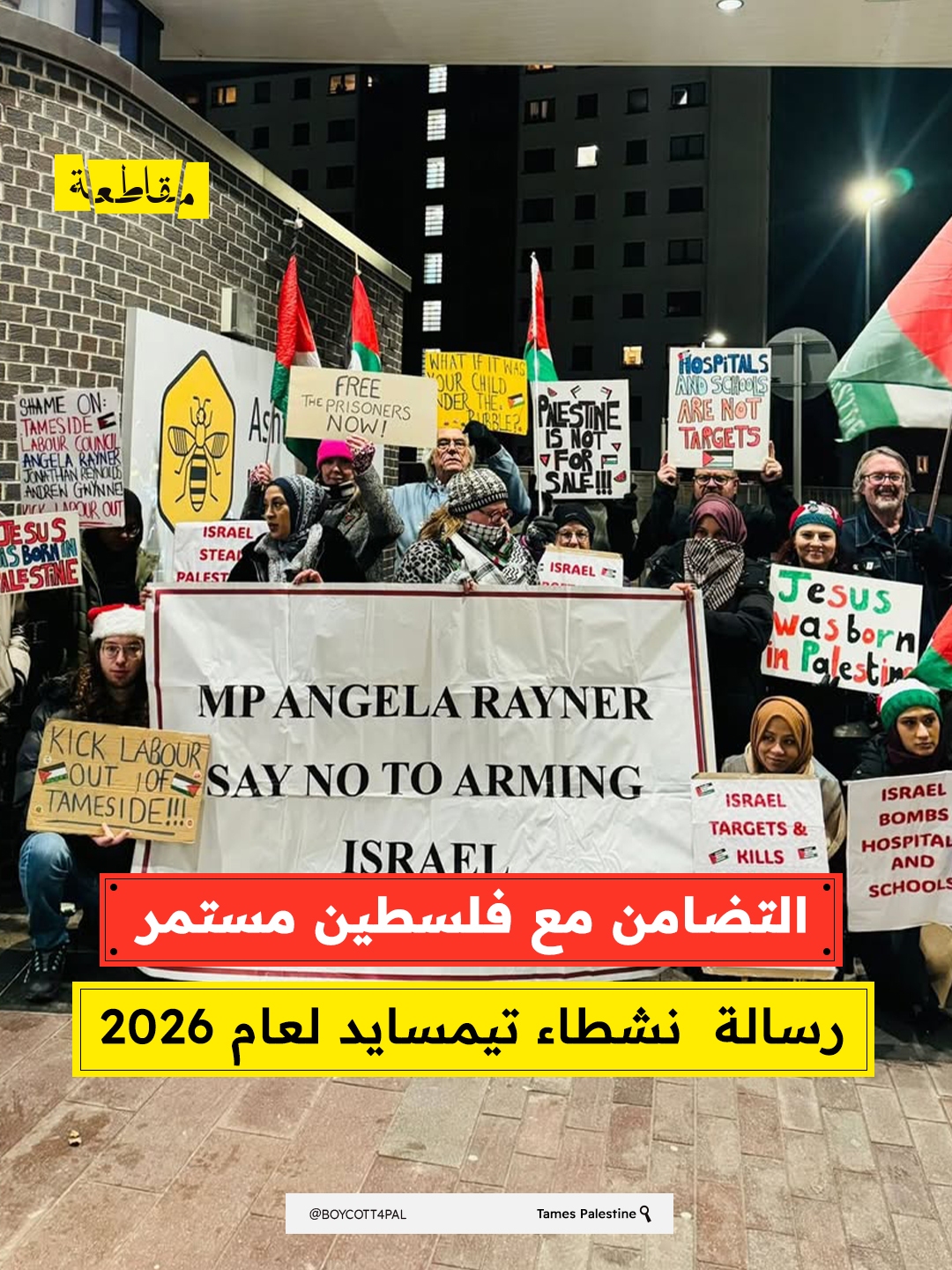 وأشار البيان الصادر عن الناشطين إلى أن احتجاجهم الأخير بعث رسالة واضحة لا يمكن تجاهلها: تيمسايد تقف بحزم مع فلسطين، مؤكدين أن الحركة التضامنية مع الشعب الفلسطيني ستستمر في العام الجديد، أقوى وأكثر وحدة من أي وقت مضى.