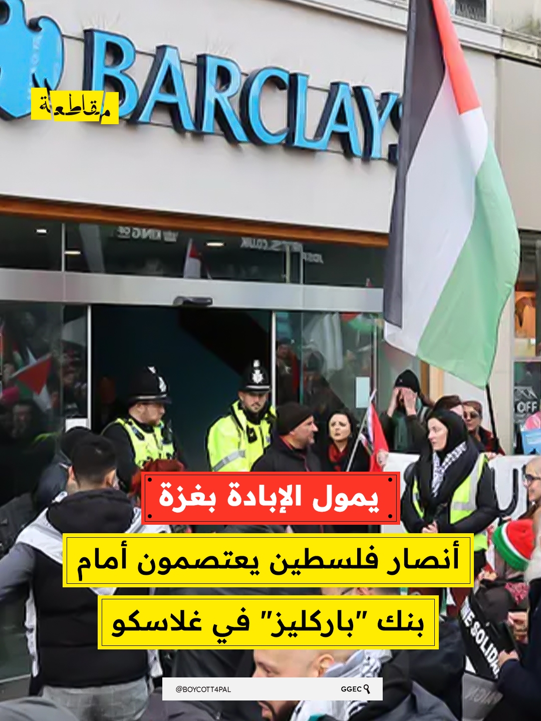 اعتصم متظاهرون مؤيدين لفلسطين أمس السبت مجددًا أمام بنك "باركليز" في مدينة غلاسكو الأسكتلندية، احتجاجًا على دور البنك في تسليح وتمويل الاحتلال الإسرائيلي والإبادة الجماعية في غزة. وقال المتظاهرون: “بينما نسمع عن الجهود البطولية التي يبذلها أهالي غزة للحفاظ على حياتهم واستمرار وجودهم، نحن هنا لنُظهر دعمنا الدائم والفعال لهم”.