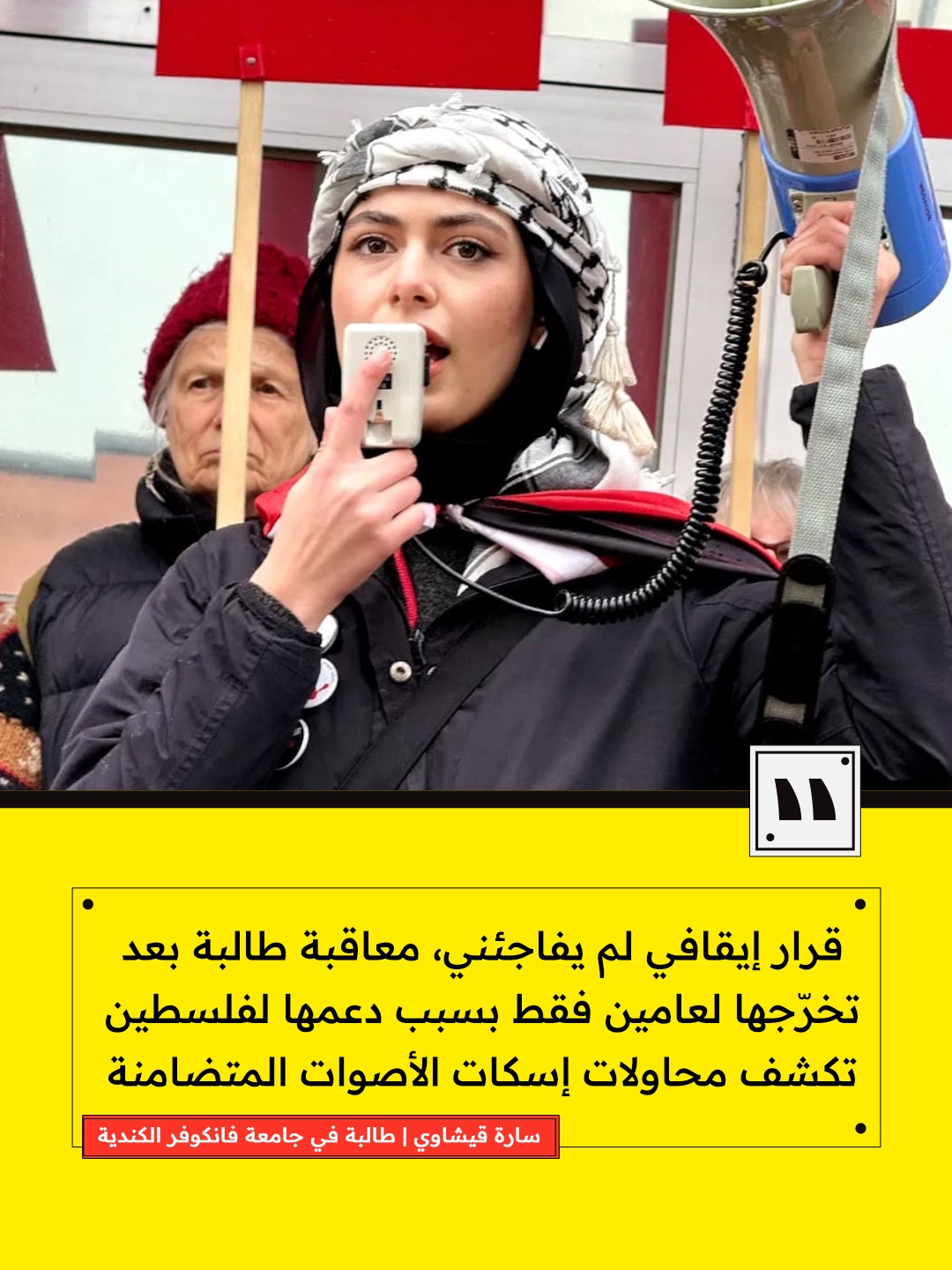 أثارت قضية الطالبة سارة قيشاوي موجة واسعة من الجدل في كندا، بعد قرار جامعة “فانكوفر آيلاند” إيقافها عن الدراسة لمدة عامين، رغم إتمامها متطلبات التخرّج، على خلفية مواقفها الداعمة للقضية الفلسطينية. ووصفت قيشاوي القرار بأنه “سخيف وغير مبرَّر”، معتبرة أنه يعكس سياسة عقابية تستهدف حرية التعبير والتضامن السياسي داخل المؤسسات الأكاديمية.
