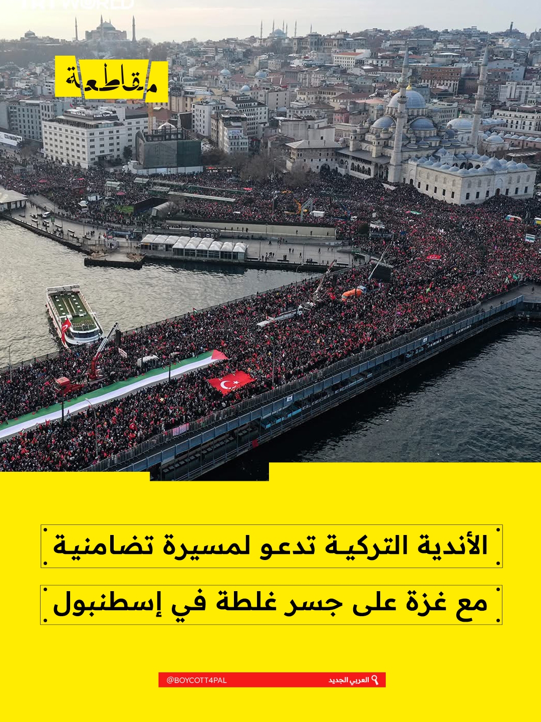 دعت أندية تركية جماهيرها والمواطنين إلى المشاركة في مسيرة تضامنية مع قطاع غزة، تُنظم في الأول من يناير/ كانون الثاني المقبل على جسر غلطة بمدينة إسطنبول، تعبيرًا عن الدعم للفلسطينيين الذين يواجهون تداعيات حرب الإبادة التي يشنها الاحتلال منذ السابع من أكتوبر/ تشرين الأول 2023.