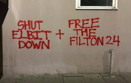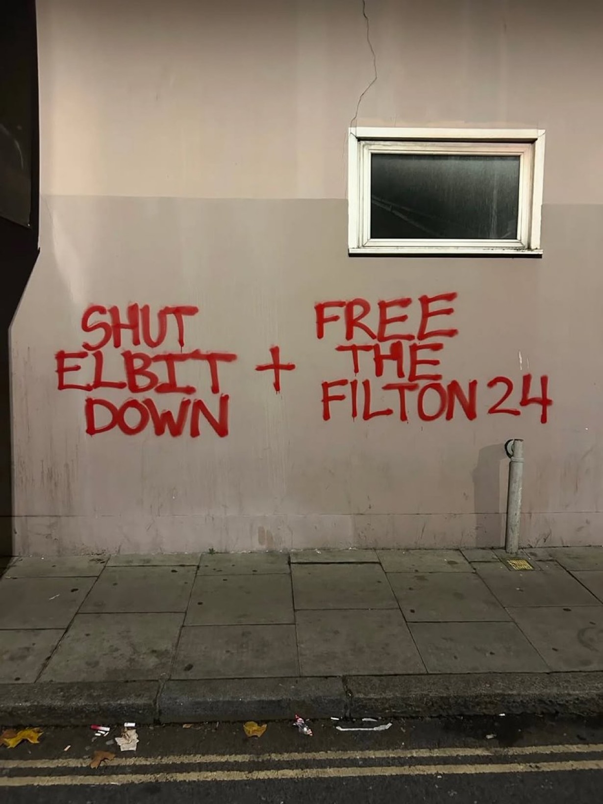 ظهرت كتابات ورسومات جدارية في شوارع العاصمة البريطانية لندن تضامنًا مع نشطاء "حركة فلسطين" المضربين عن الطعام والمحتجزين في سجون المملكة المتحدة، رفضًا لاعتقالهم التعسفي. وكان النشطاء قد اعتُقلوا سابقًا على خلفية تحركات احتجاجية استهدفت شركة Elbit Systems المتورطة في تسليح الاحتلال، قبل أن يتم احتجازهم رهن الحبس الاحتياطي لفترات وصلت إلى عامين دون محاكمة.