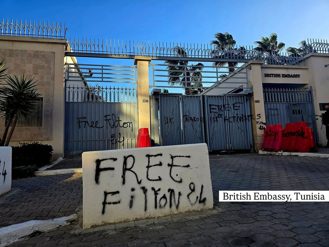 نظّمت "حركة فلسطين" في تونس احتجاجًا أمام السفارة البريطانية، طالبت خلالها بالإفراج عن نشطاء "حركة فلسطين" المضربين عن الطعام في السجون البريطانية "فيلتون 24".