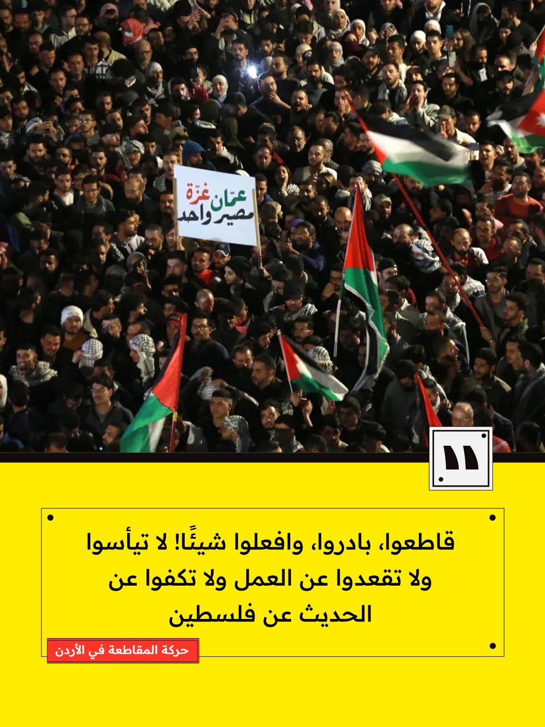 وشدّدت الحركة على أن المقاطعة والعمل الشعبي أشكال أصيلة من المقاو.مة، مطالِبةً الناس بأن يقاوموا ويقاطعوا ويبحثوا ويبادروا ويبتكروا، وأن يرفعوا أصواتهم ويفعلوا شيئًا، من دون يأس أو صمت أو توقّف عن الحديث عن فلسطين.