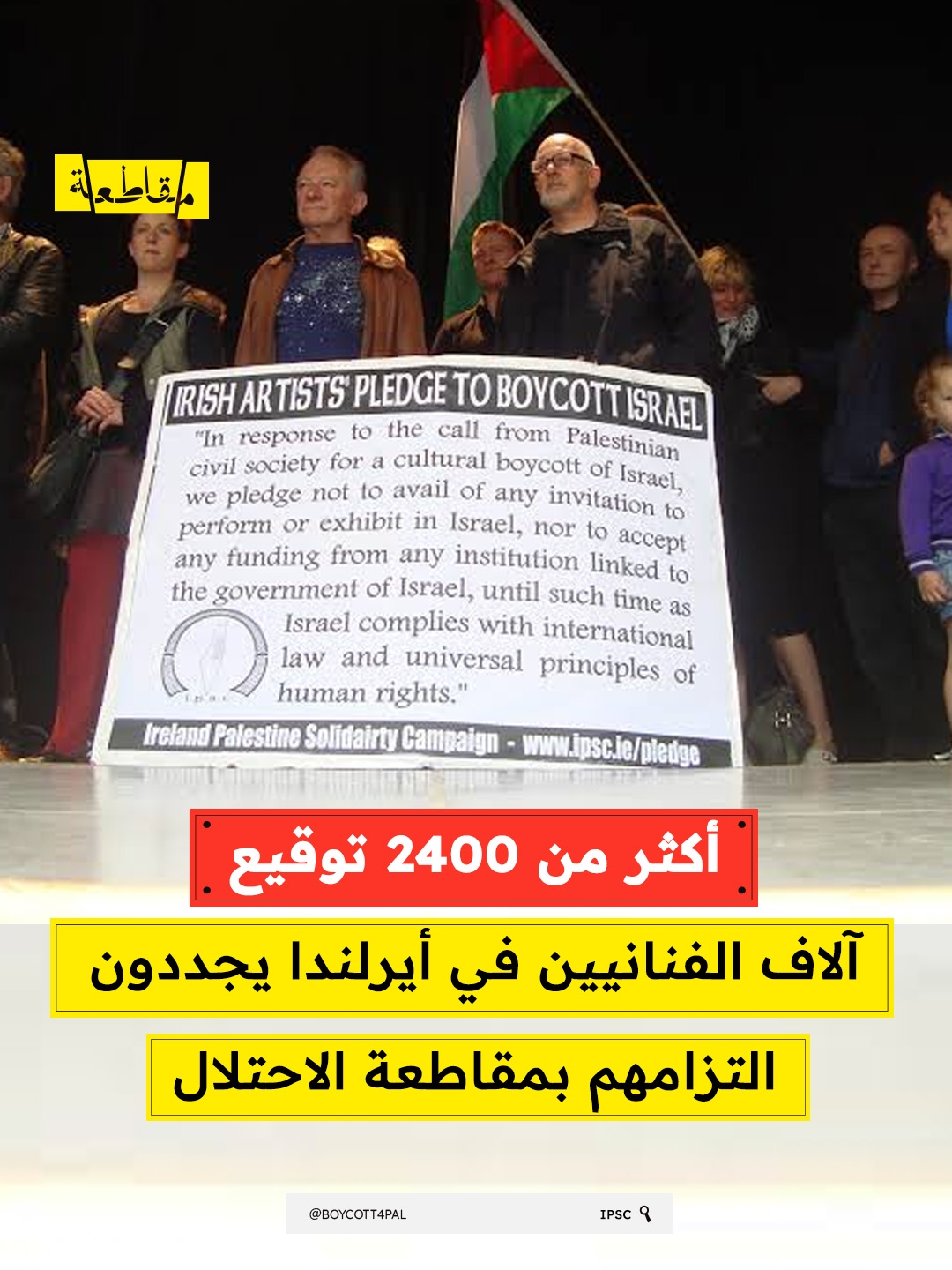 تجاوز عدد الموقعين على تعهّد الفنانين الأيرلنديين بمقاطعة إسرائيل 2415 فنانًا، في مؤشر قوي على التضامن المستمر مع الشعب الفلسطيني ورفض الانتهاكات الاستيطانية في الأراضي المحتلة. تأتي هذه المبادرة ضمن حملة موسعة لدعم حقوق الفلسطينيين ومناهضة نظام الفصل العنصري، مؤكدين أن الفن والثقافة أدوات فعّالة للضغط على الاحتلال وكشف الانتهاكات أمام الرأي العام الدولي.