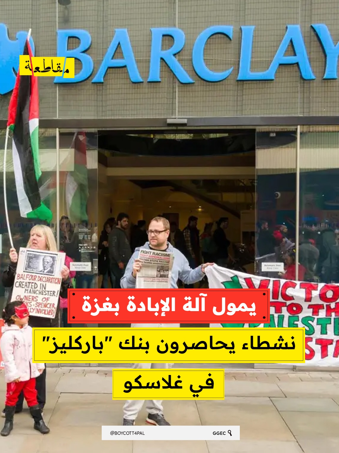 اعتصم متظاهرون مؤيدين لفلسطين أمس السبت مجددًا أمام بنك "باركليز" في مدينة غلاسكو الأسكتلندية، احتجاجًا على دور البنك في تسليح وتمويل الاحتلال الإسرائيلي والإبادة الجماعية في غزة. وقال المتظاهرون