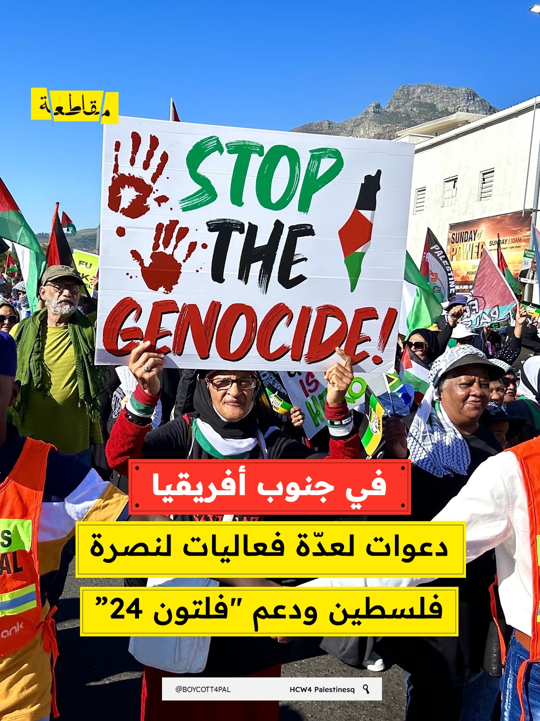 تنظم حركة العاملون الصحيون من أجل فلسطين جنوب أفريقيا سلسلة فعاليات ومظاهرات وطنية في كيب تاون وجوهانسبرغ ودوربان، ضمن أسبوع من النشاط التضامني مع فلسطين، وللمطالبة بالإفراج عن نشطاء "فلتون 24”، الذين يخوضون إضرابًا عن الطعام يهدد حياتهم داخل السجون البريطانية .