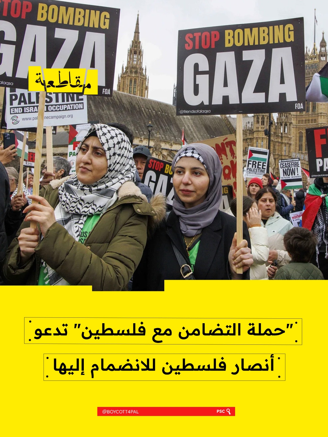 دعت حملة التضامن مع فلسطين (PSC) في المملكة المتحدة المواطنين للانضمام كأعضاء في أكبر حركة احتجاجية شعبية مناهضة للإبادة الجماعية التي ترتكبها "إسرائيل" في غزة.