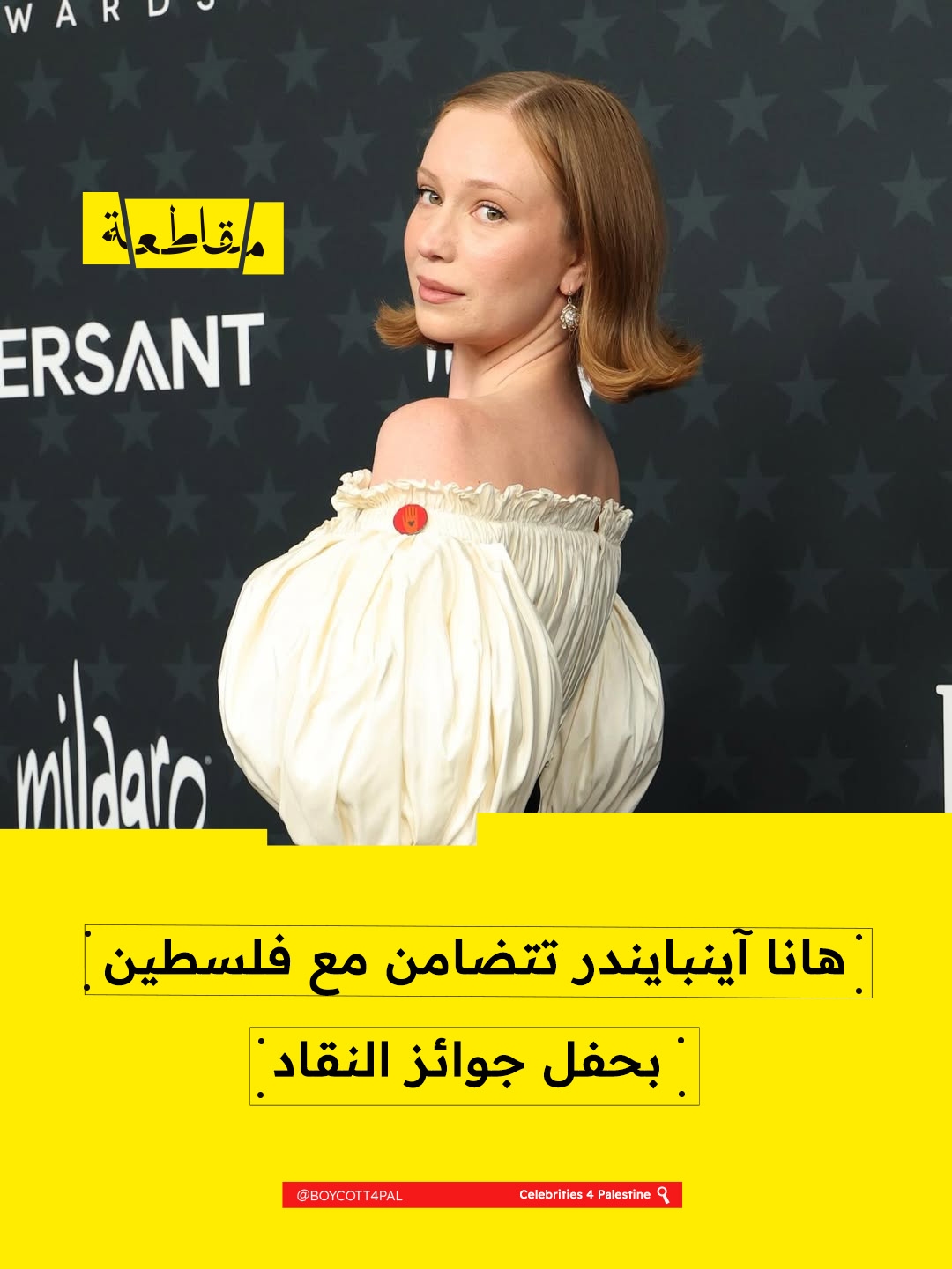في حفل جوائز النقاد (Critics Choice Awards)، لفتت الممثلة الأمريكية هانا آينبايندر (Hannah Einbinder) الأنظار بظهورها مرتدية شارة Artists For Ceasefire، في خطوة تضامنية مع فلسطين، وذلك رغم الانتقادات والهجوم الذي واجهته سابقًا بسبب مواقفها العلنية الداعمة للشعب الفلسطيني.