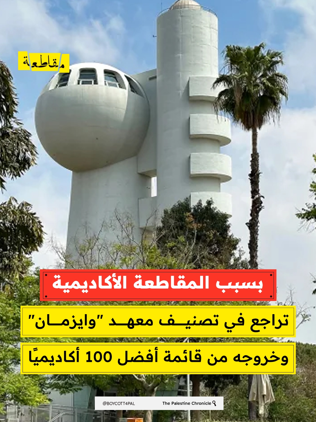 ويمثل هذا التصنيف المرة الأولى التي يخرج فيها معهد "وايزمان" من قائمة أفضل 100 مؤسسة عالميًا، سواء على مستوى المؤسسات الأكاديمية أو في الترتيب العام. فقد تراجع أكاديميًا من المركز 75 العام الماضي إلى 111، بينما هبط في التصنيف العام من 82 إلى 122 خلال عام واحد، أي بانخفاض يزيد على 25 بالمائة.