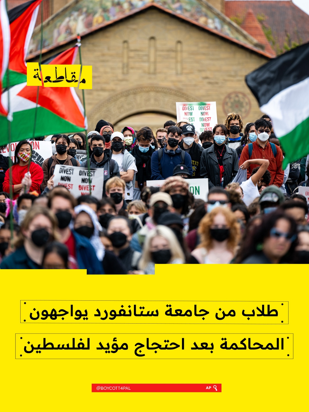 دعت مجموعة “طلاب من أجل العدالة في فلسطين” (USFCastudents4Palestine) النشطاء والداعمين لفلسطين إلى حضور جلسات المحاكمة المفتوحة للطلاب المعروفين باسم “ستانفورد 11”، بأمريكا ، المقررة يوم الجمعة 9
