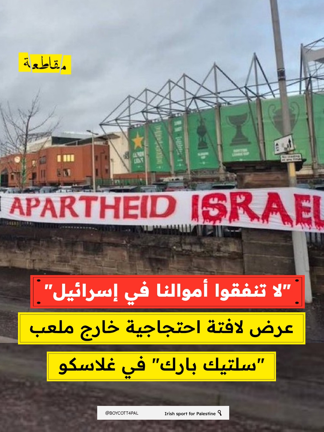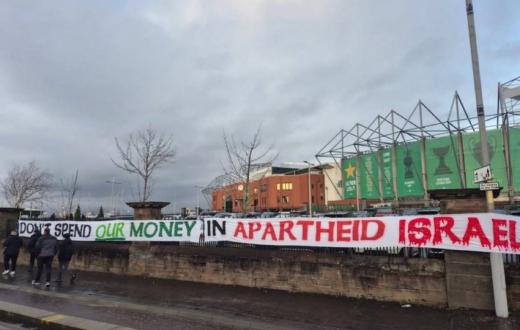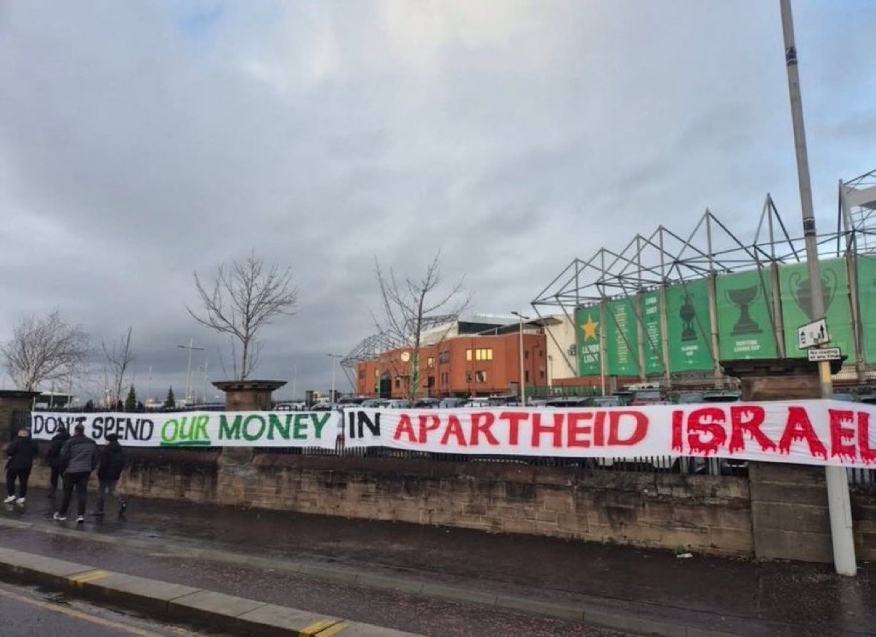رفع مشجعون لافتة احتجاجية خارج ملعب "سلتيك بارك" في غلاسكو تنديدًا بما تردّد عن توقيع نادي سلتيك مع اللاعب جوسلين تا بي، الجناح في فريق "مكابي نتانيا" الإسرائيلي. وجاء في اللافتة: "لا تنفقوا أموالنا في إسرائيل العنصرية"، في رسالة واضحة تطالب إدارة النادي بعدم الارتباط بأندية أو جهات مرتبطة بالاحتلال.