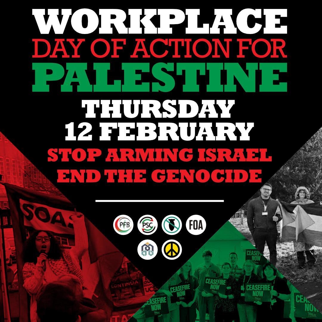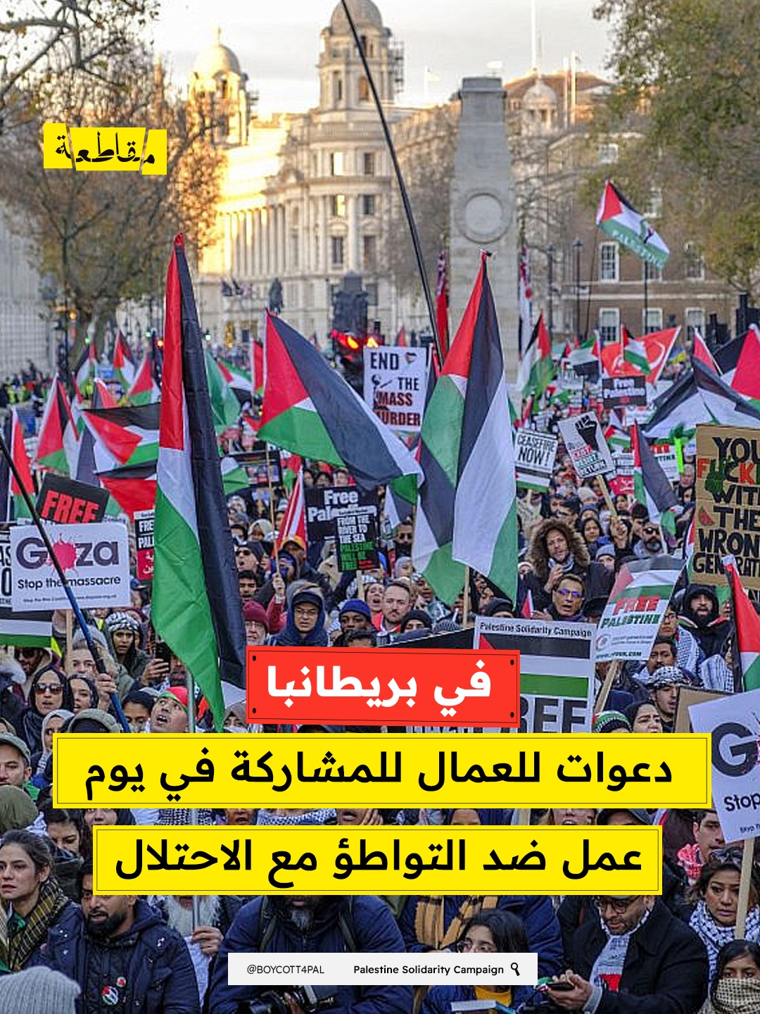 دعت "حملة التضامن مع فلسطين" العمال في جميع القطاعات إلى المشاركة في يوم العمل التضامني مع فلسطين يوم الخميس 12 فبراير، لمواجهة التواطؤ في الإبادة الجماعية التي تمارسها "إسرائيل" والمطالبة بالعدالة للشعب الفلسطيني.