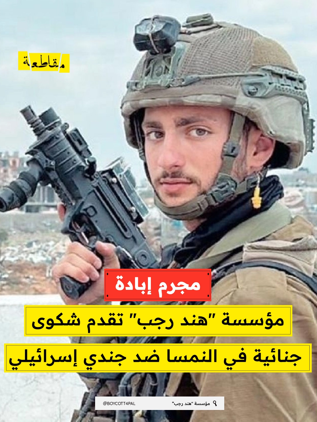 أعلنت "مؤسسة هند رجب" عن تقديم شكوى جنائية أمام النيابة العامة العليا في "براغ" ضد الجندي الإسرائيلي "هغاي مونسونيغو". وأوضحت المؤسسة، في بيان نشرته على موقعها الرسمي، أن الشكوى قُدّمت بعد التحقق م