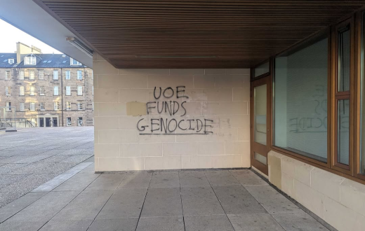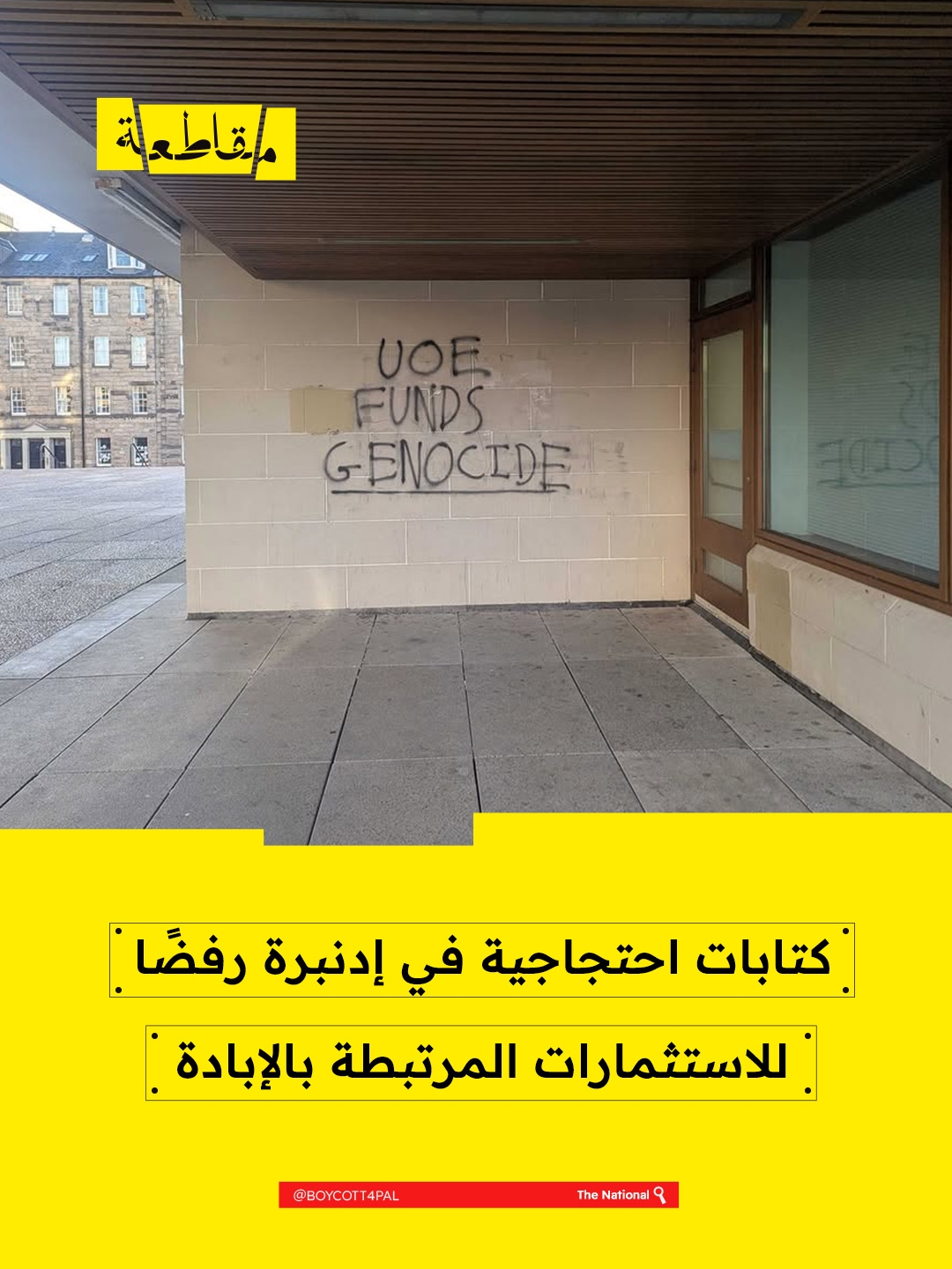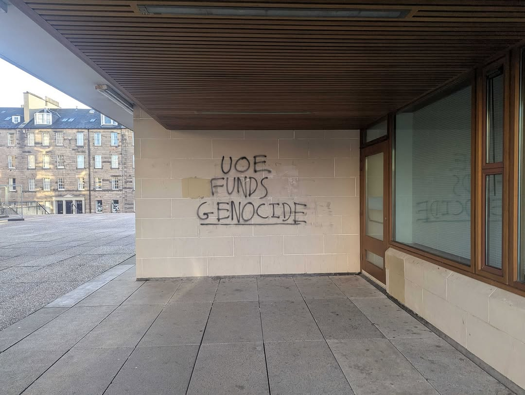 استهدف أنصار فلسطين حرم جامعة إدنبرة بكتابات جدارية، في خطوة احتجاجية جديدة ضد ما وصفوه بتواطؤ الجامعة في تمويل الإبادة الجماعية المستمرة بحق الشعب الفلسطيني في قطاع غزة. وتركزت الاحتجاجات يوم الاث
