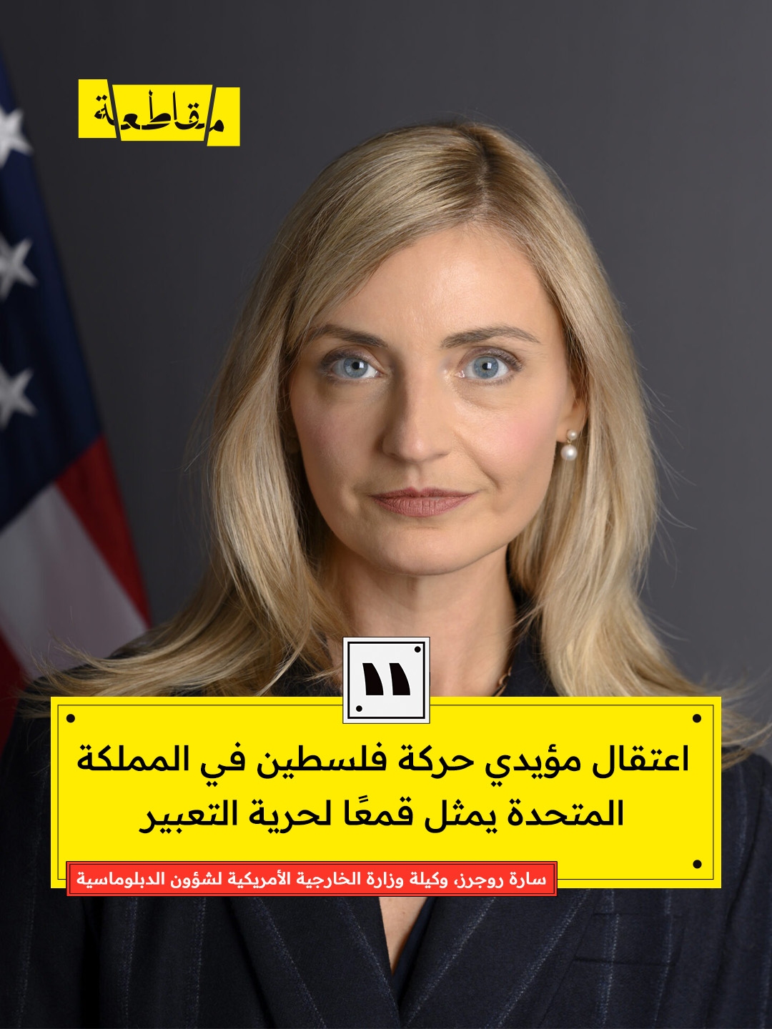 أكدت سارة روجرز، وكيلة وزارة الخارجية الأمريكية لشؤون الدبلوماسية العامة في إدارة ترامب، أن اعتقال مؤيدي "حركة فلسطين" في المملكة المتحدة يمثل قمعًا لحرية التعبير، ويُعد “ضررًا أكبر من نفعه”.