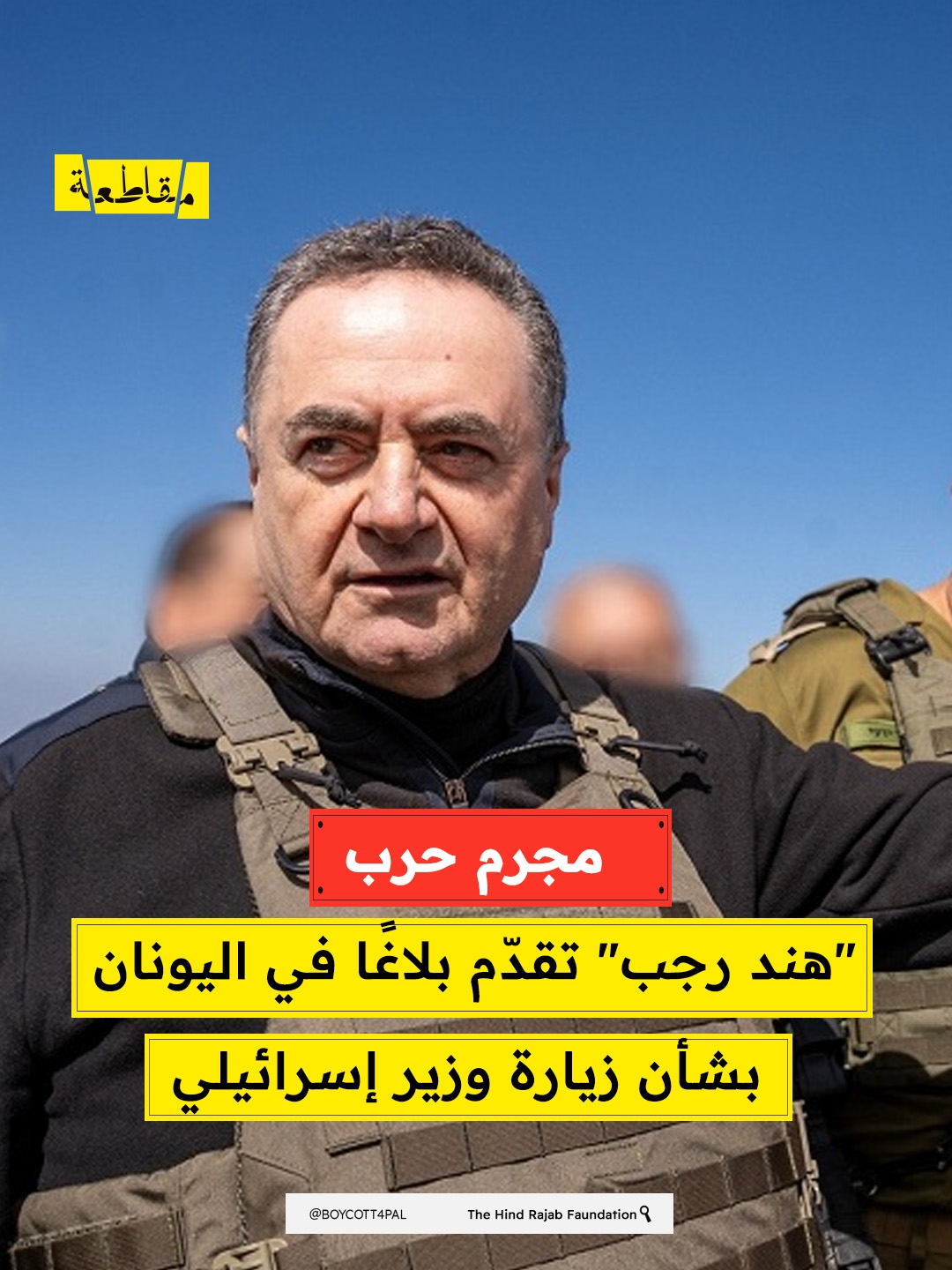 قدّمت مؤسسة هند رجب (HRF)، أمس الأربعاء، بلاغًا رسميًا إلى المدعي العام لدى المحكمة العليا في اليونان، على خلفية زيارة وزير الجيش الإسرائيلي، يسرائيل كاتس، إلى البلاد لعقد اجتماعات رسمية مع مسؤولين سياسيين وعسكريين يونانيين.