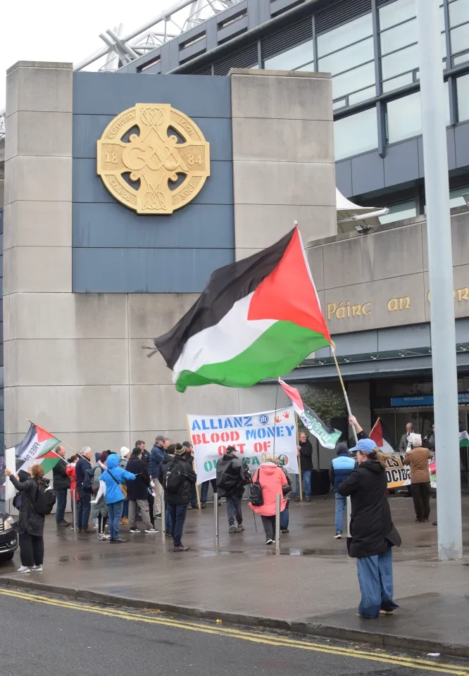 تجمّع أنصار فلسطين، أمام مقر اتحاد الرياضات الغيلية في كروك بارك بدبلن، احتجاجًا على استمرار رعاية شركة "أليانز" للاتحاد. ونُظّمت الوقفة بدعوة من منظمات "دبلن من أجل فلسطين" و"الرياضة الأيرلندية من أجل فلسطين" و"الغيل ضد الإبادة الجماعية".