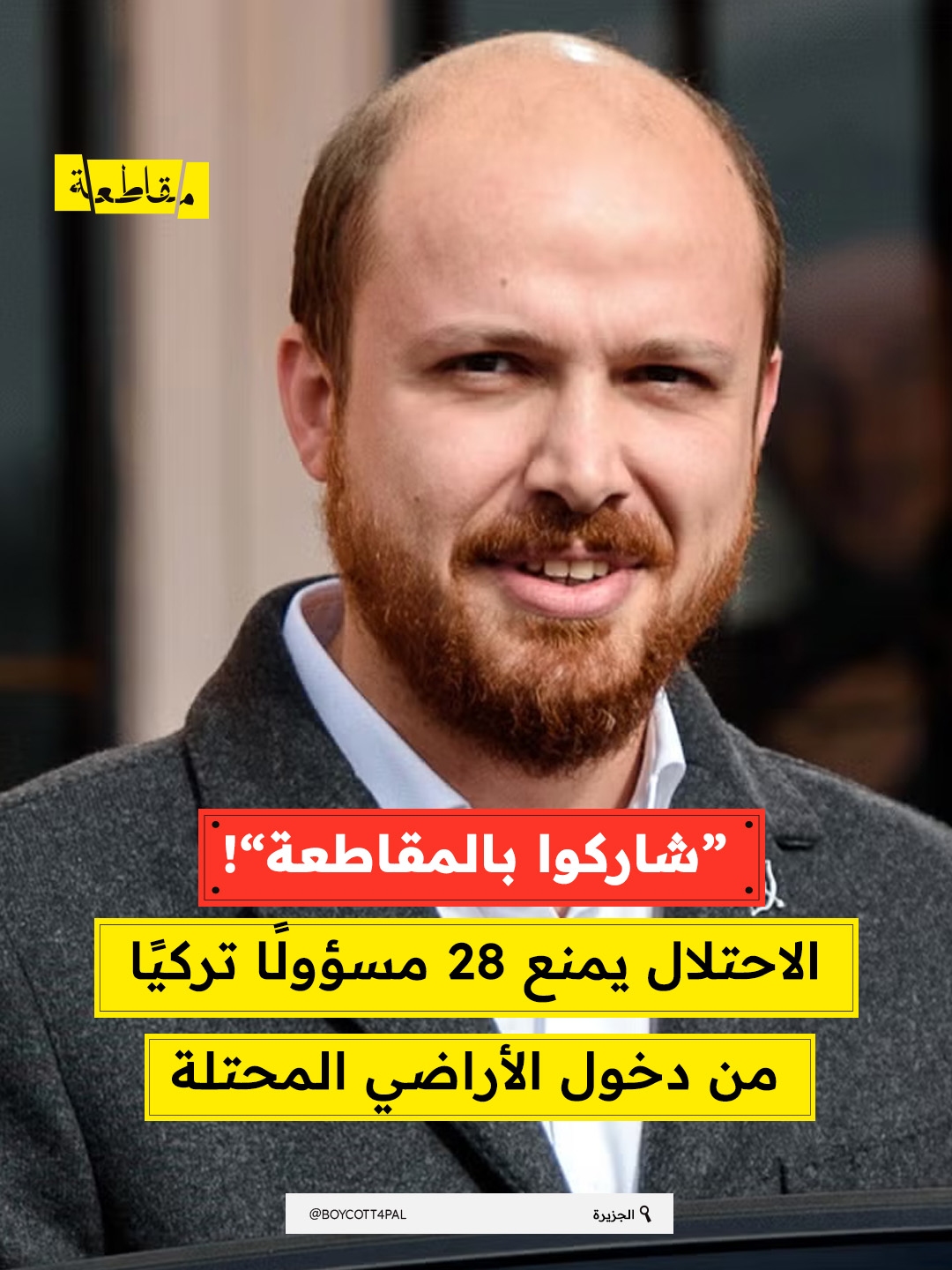 وقالت ما تسمى وزارة الشتات الإسرائيلية انها منع 28 مسؤولًا تركيًا رفيع المستوى بينهم الناشط بلال أردوغان ورئيس هيئة الإغاثة بولنت يلدريم ورئيس الشؤون الدينية السابق علي أرباش من دخول "إسرائيل" لتورطهم في أنشطة المقاطعة وتمجيد العنف ضد "إسرائيل" ولمشاركة أردوغان الابن في كافة الفعاليات والتظاهرات التركية الداعمة للفلسطينيين منذ بداية الحرب في غزة، بحسب وصف ومزاعم الوزارة.
