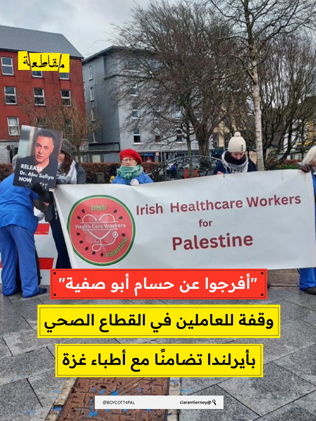 "أفرجوا عن حسام أبو صفية" وقفة للعاملين في القطاع الصحي بأيرلندا تضامنًا مع أطباء غزة