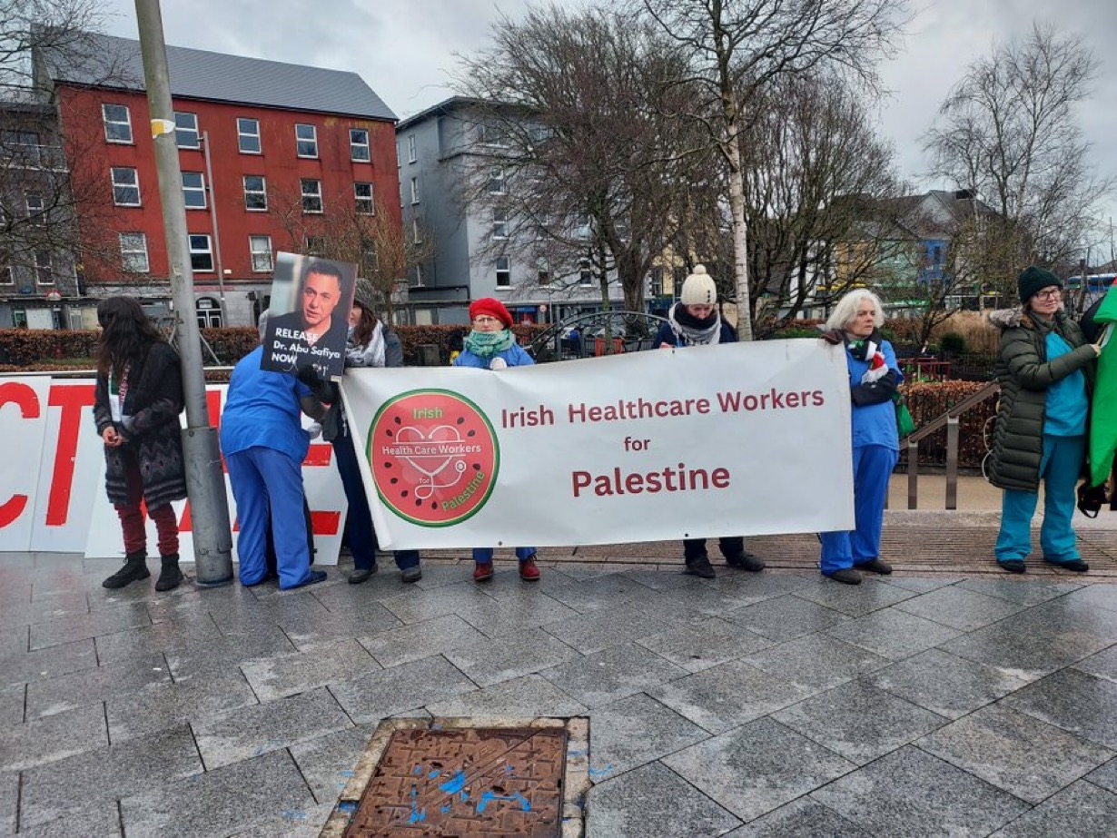 شهدت مدينة غالواي الأيرلندية وقفة تضامنية نظّمها تجمع العاملين في القطاع الصحي لإيرلندا من أجل فلسطين (Irish Healthcare Workers for Palestine)، تضامنًا مع أطباء قطاع غزة والمطالبة بالإفراج عن مدير مستشفى كمال عدوان، الدكتور حسام أبو صفية، الذي اعتُقل في ديسمبر الماضي.