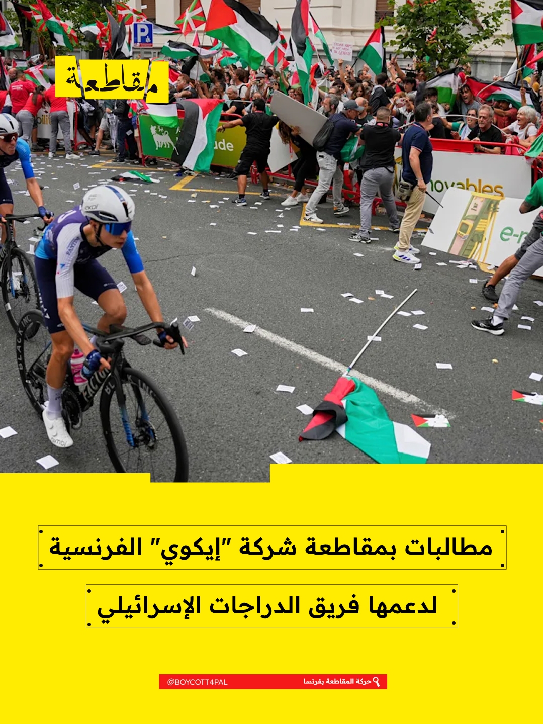 دعت حركة المقاطعة في فرنسا إلى مقاطعة شركة EKOÏ الفرنسية المتخصصة في معدات ركوب الدراجات، على خلفية استمرار رعايتها لفريق الدراجات الإسرائيلي Israel Premier Tech، رغم الانتقادات الواسعة الموجهة للفريق بسبب ارتباطه بسياسات الاحتلال الاستيطانية. وأكدت الحركة أن استمرار هذه الشراكة يتناقض مع القيم الأخلاقية والرياضية، ويُسهم في تلميع صورة نظام فصل عنصري متهم بارتكاب إبادة جماعية بحق الشعب الفلسطيني.